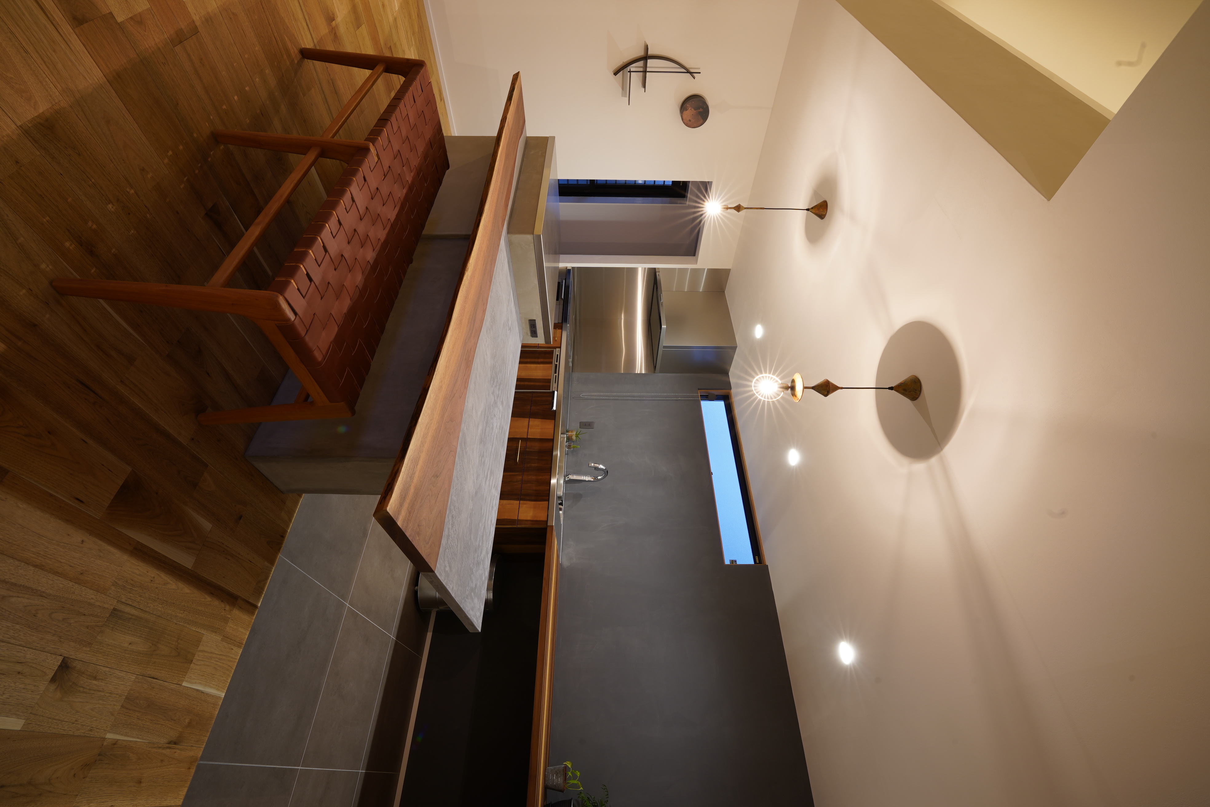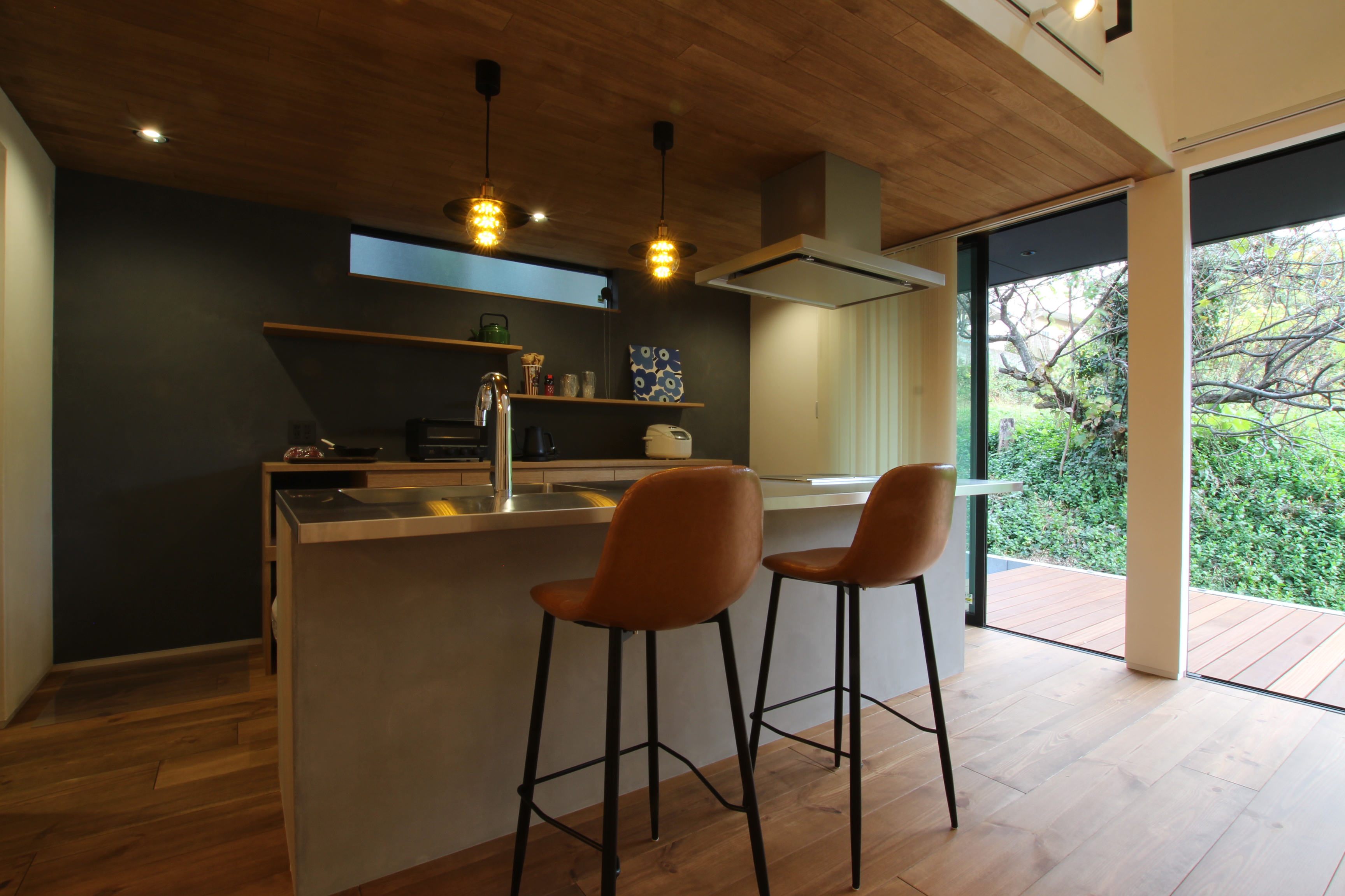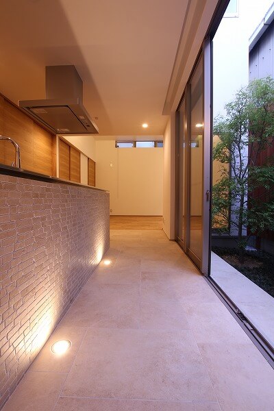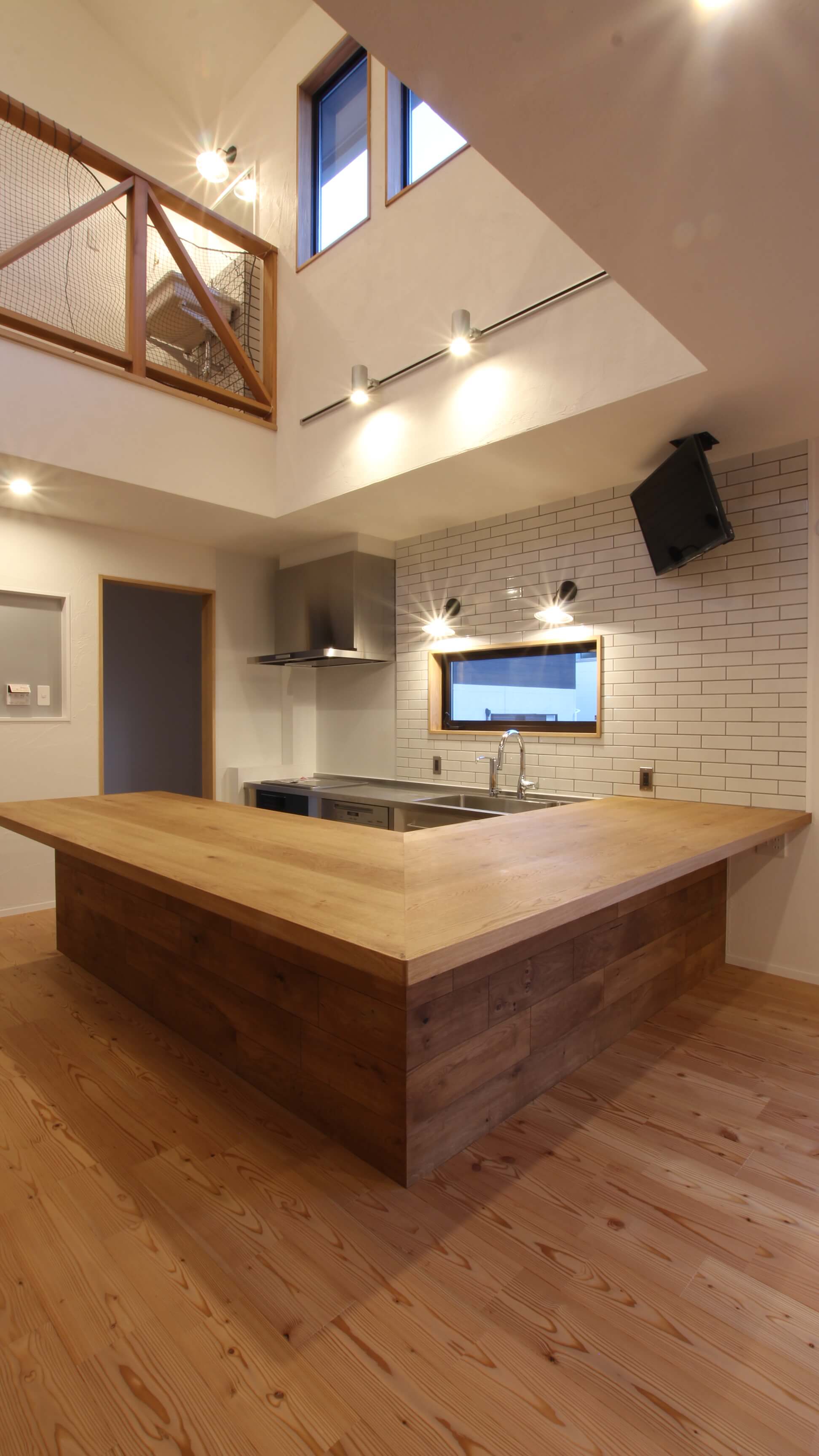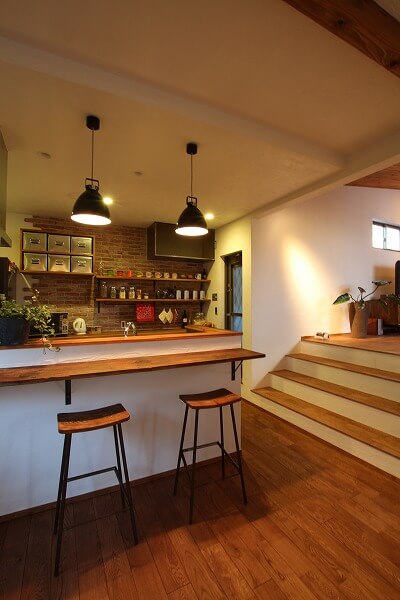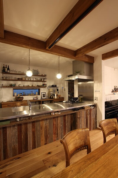 古材やブリックタイルをふんだんに使い、素材の経年変化を楽しめる空間に合わせたキッチン。