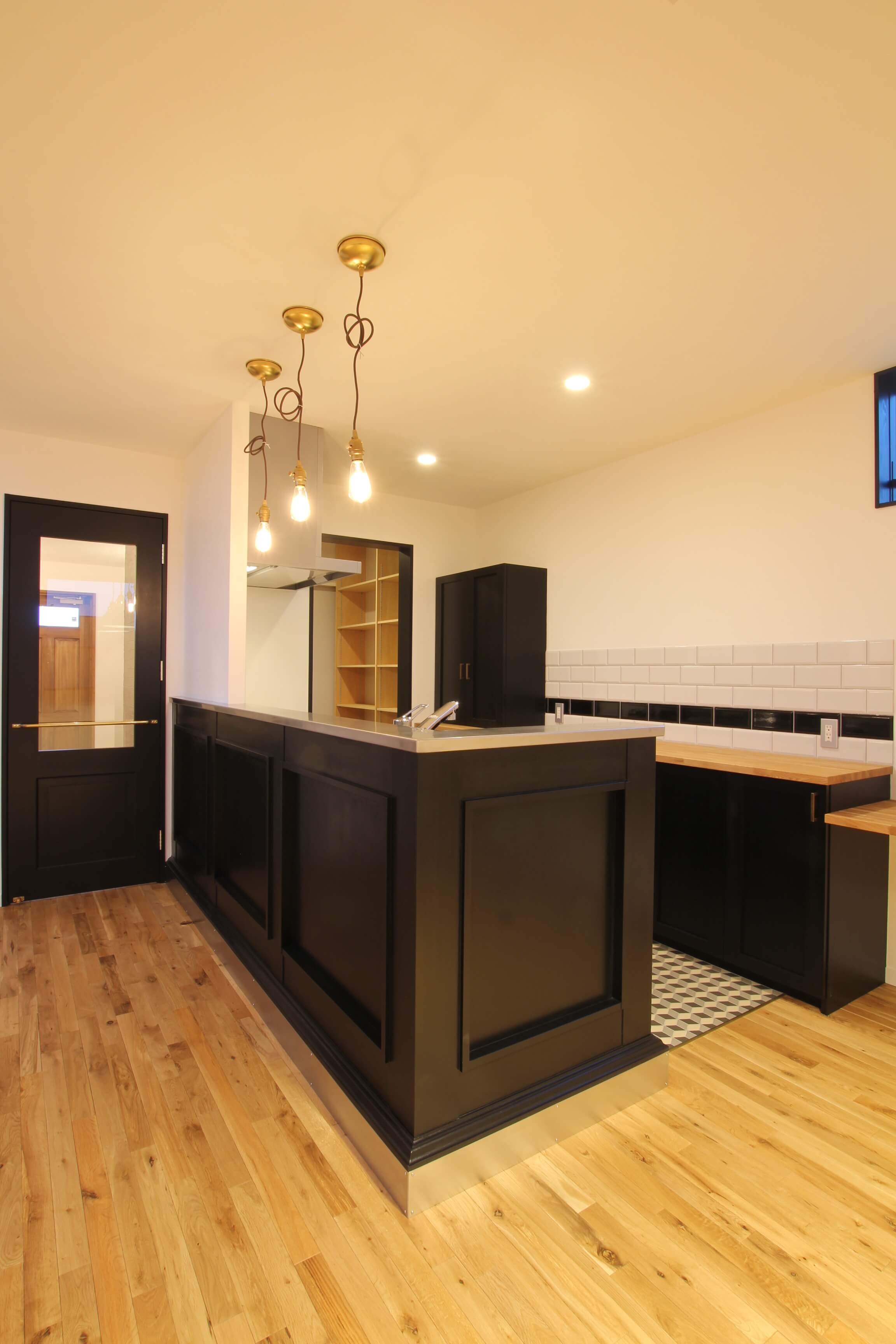 ペニンシュラ型の一種ではあるが、奥のパントリーから玄関へと回遊でき、動線を考えているキッチン