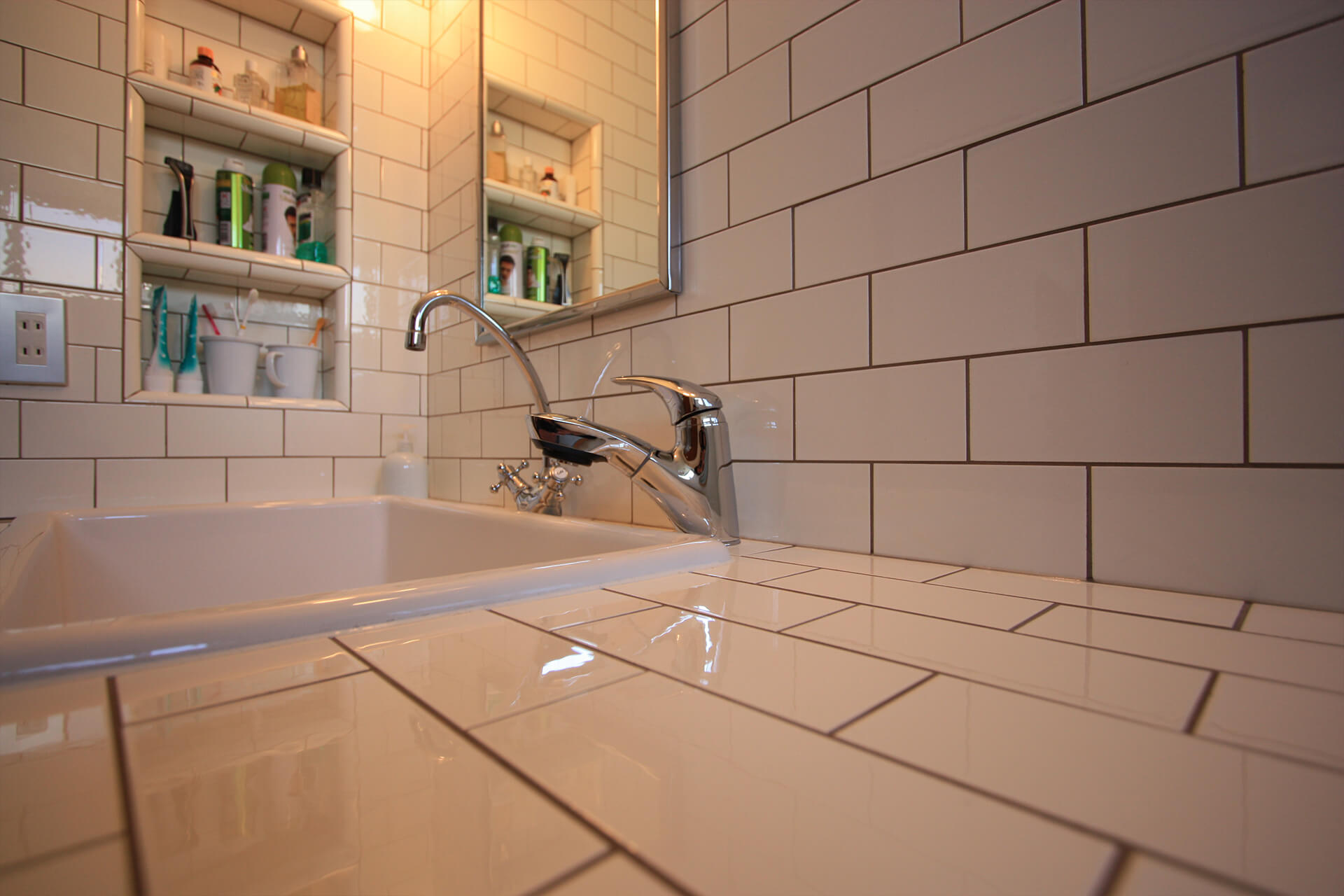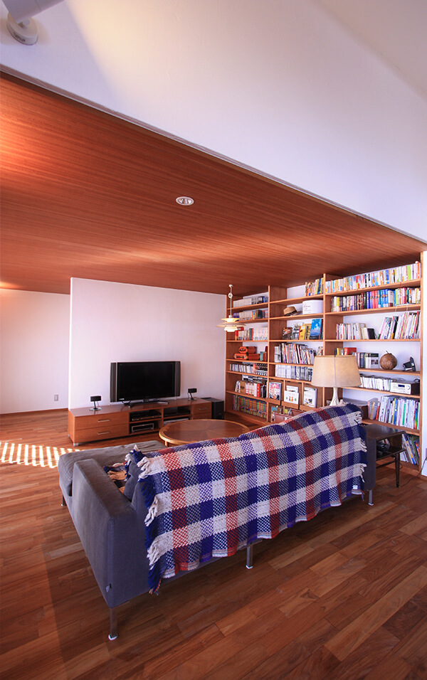 床材にはチークを、天井にはマコーレの突板を貼って高級感とアンティーク感を演出。「厨房のようなキッチンにしたい」というお施主様の想いを受け製作した、幅4.4mもあるステンレスキッチンはハナハウスのオリジナル。キッチンとサニタリーには、アメリカから取り寄せたサブウェイタイルを貼り、昔のホテルのような雰囲気に。お施主様があちこちから見つけたアイテムもこの家の見どころです。