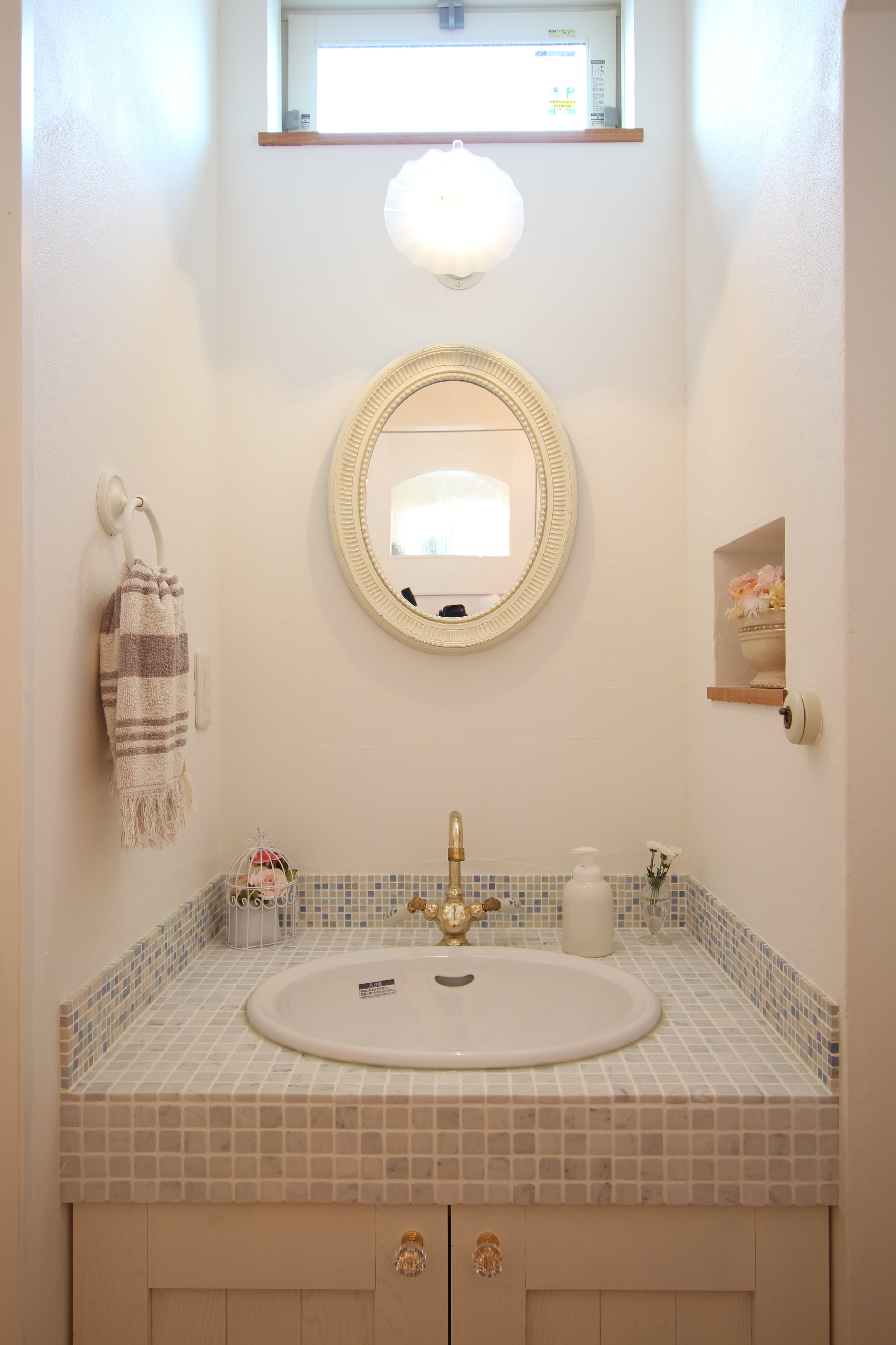 ブロンズの水栓や水色のモザイクタイルがかわいい手洗い