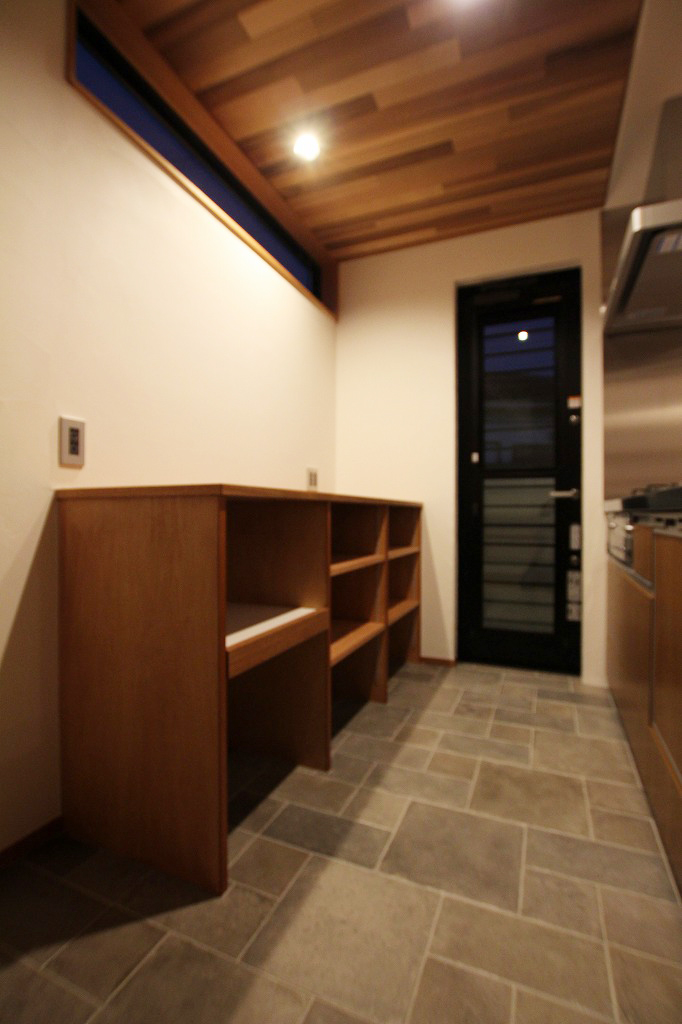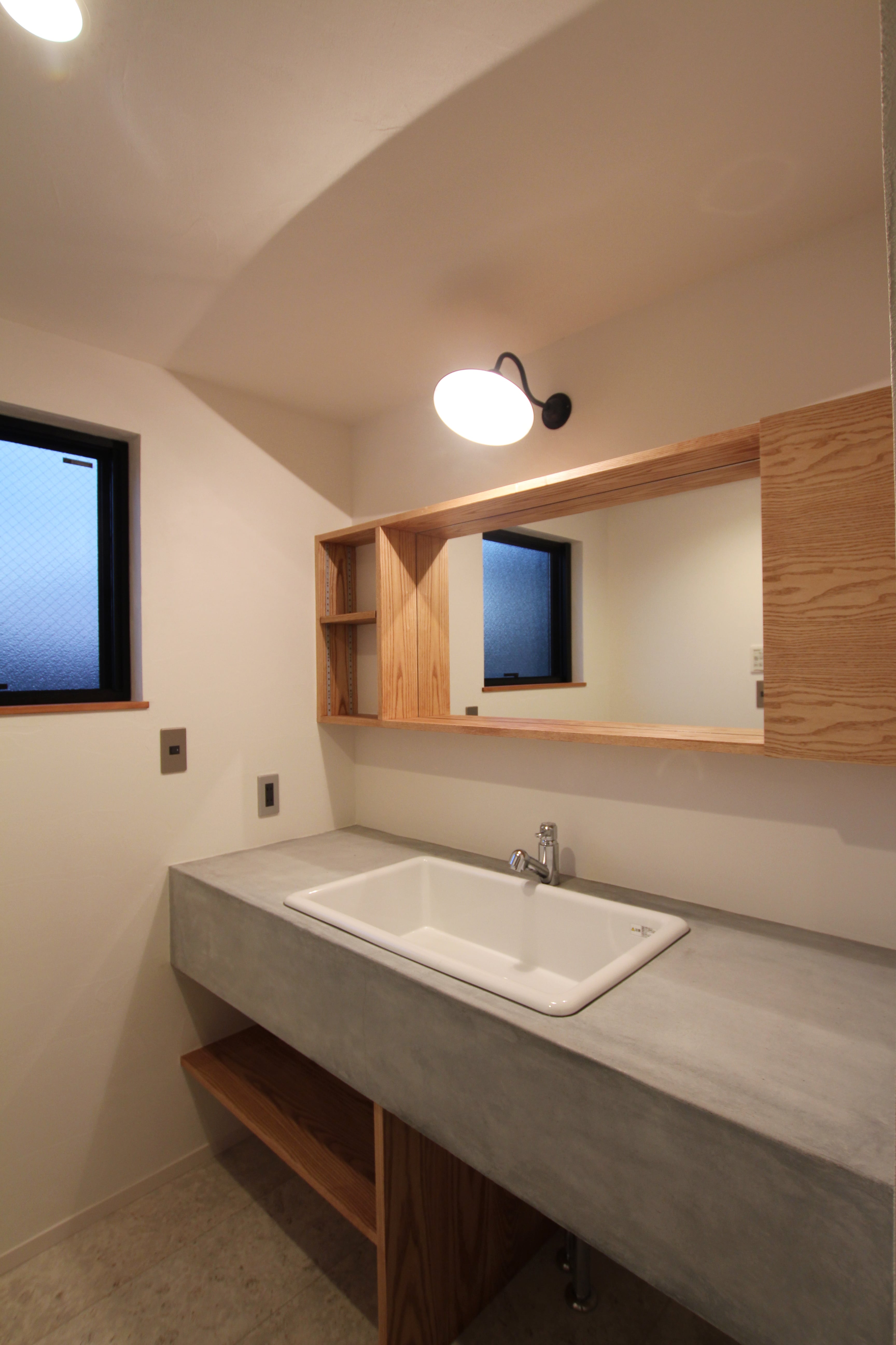 モルタルで仕上げた洗面。無機質な中にオークの板目で表情を出す