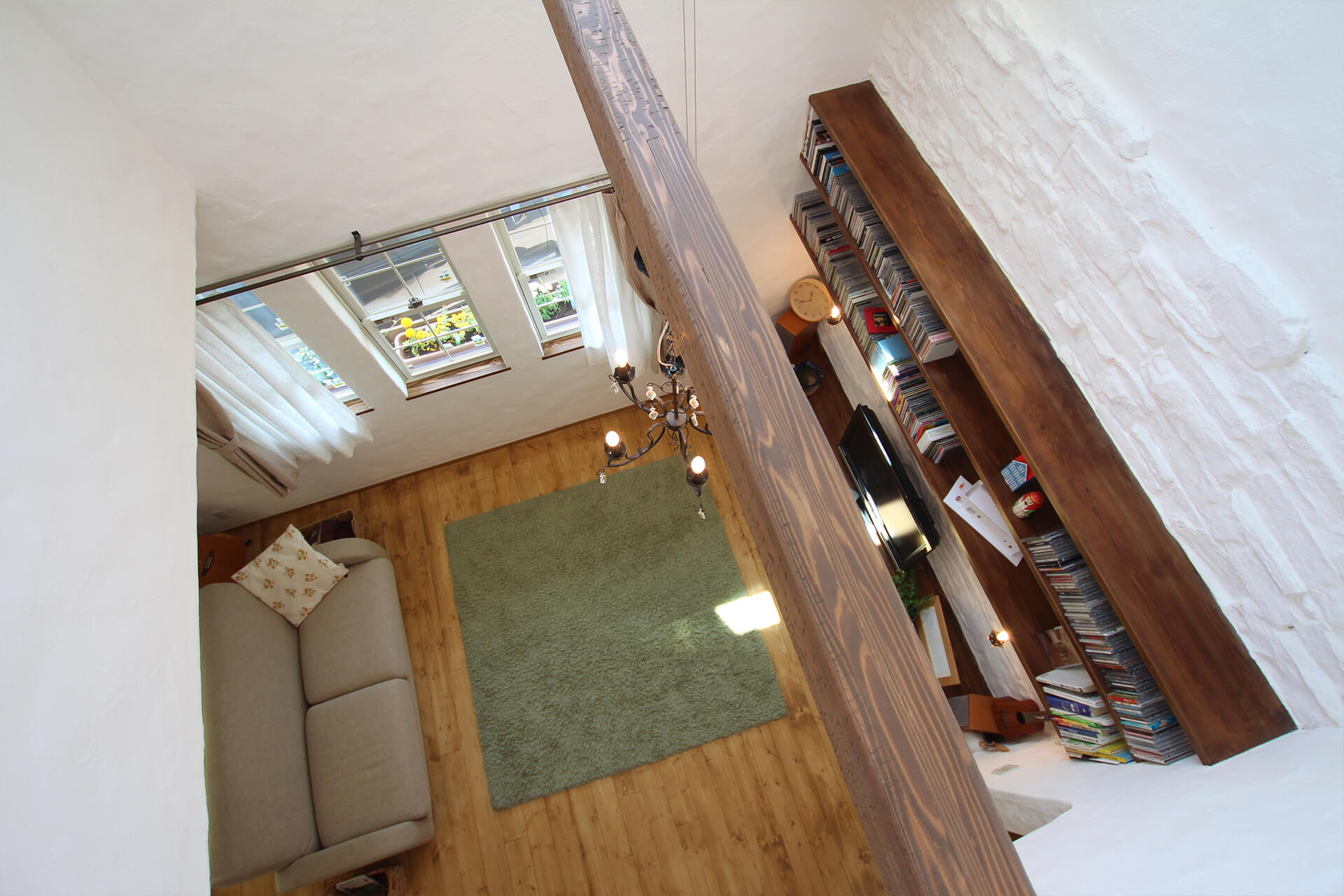 漆喰は洞窟のようなモコモコした塗り方をしてもらいシャビー感を演出。大きな吹抜けに架かる化粧梁はエイジングを施し、2階ホールにミシン&PCカウンターを造作。吹抜けに面しており、開放的で心地いい空間に。 飴色の無垢床とぽってりした凹凸のある漆喰壁に、 お気に入りの家具やアイアン、造作のTV台が映え、素敵なシャビー・フレンチの家に仕上がりました。
