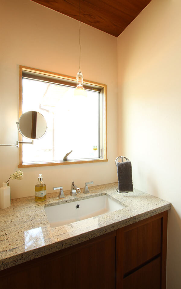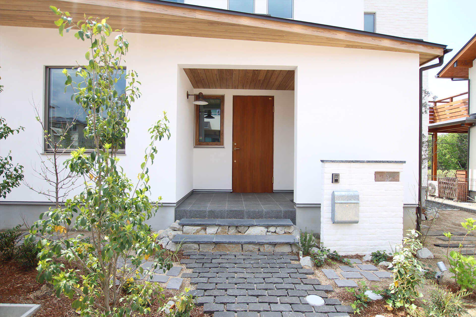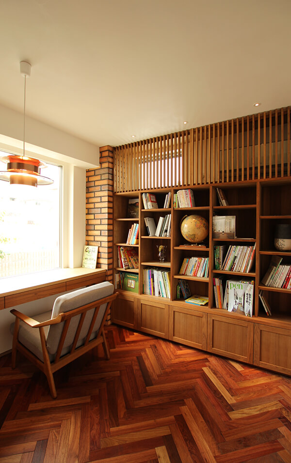 斜めにデザインした屋根に、八角形の無垢の柱。白いレンガの上から漆喰を塗った外壁…。一見シンプルなようで、深く考え抜いた外観のお家。北欧の近代建築を目指した内装は、随所にこだわりが。一番の見所はコの字型のオリジナルキッチン。大理石調の人工石を使った天板に、チークの突板で扉をつくり、クラシカルなデザインに仕上げました。リビングとダイニングの間には、重厚に作ったストリップ階段が。さらにカリンのヘリンボーンを床に使用した図書室もあり、チーク材の本棚とレンガ調のタイルを貼った壁面で、外国のような空間に。