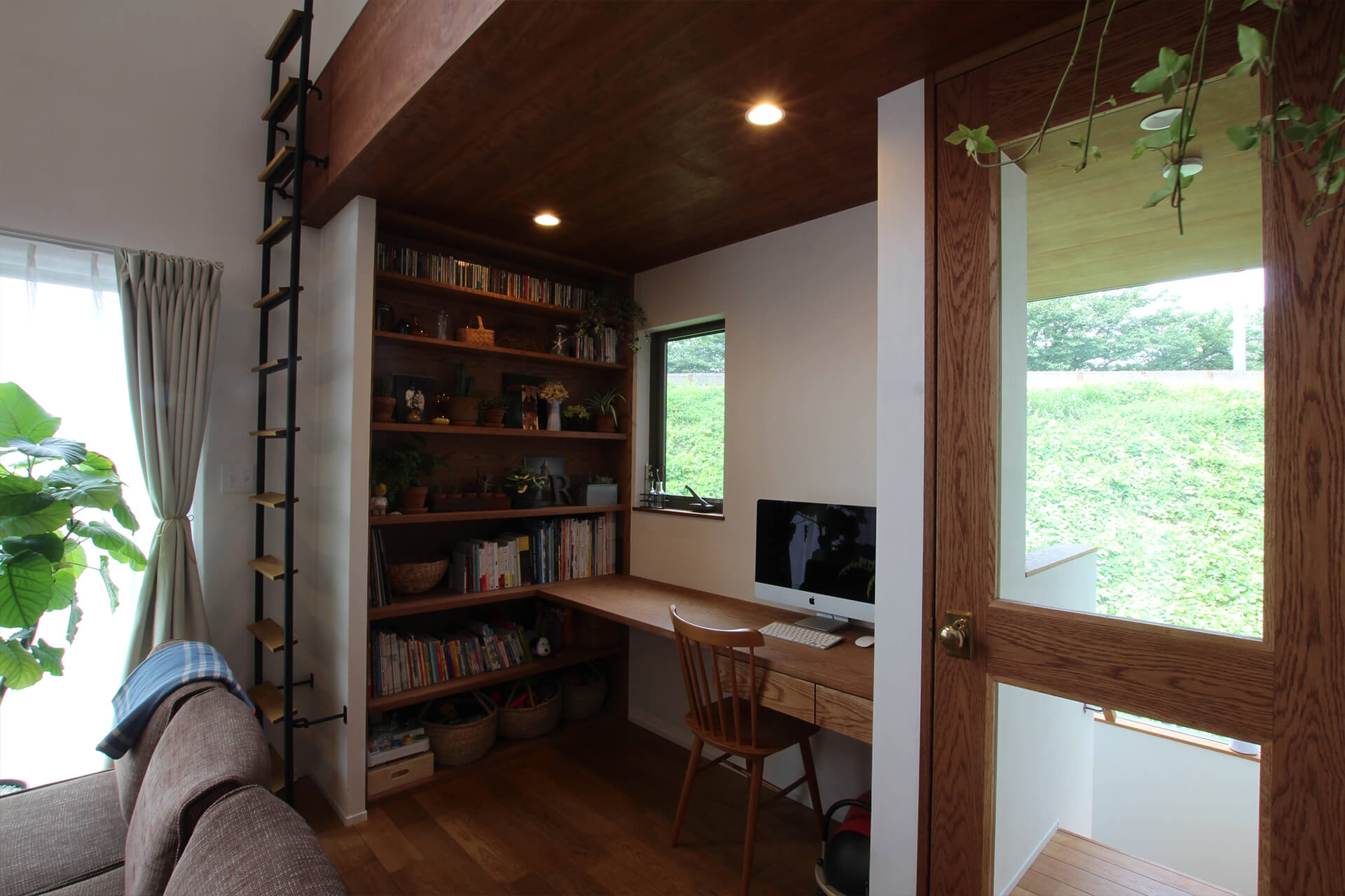 斜めにデザインした屋根に、八角形の無垢の柱。白いレンガの上から漆喰を塗った外壁…。一見シンプルなようで、深く考え抜いた外観のお家。北欧の近代建築を目指した内装は、随所にこだわりが。一番の見所はコの字型のオリジナルキッチン。大理石調の人工石を使った天板に、チークの突板で扉をつくり、クラシカルなデザインに仕上げました。リビングとダイニングの間には、重厚に作ったストリップ階段が。さらにカリンのヘリンボーンを床に使用した図書室もあり、チーク材の本棚とレンガ調のタイルを貼った壁面で、外国のような空間に。