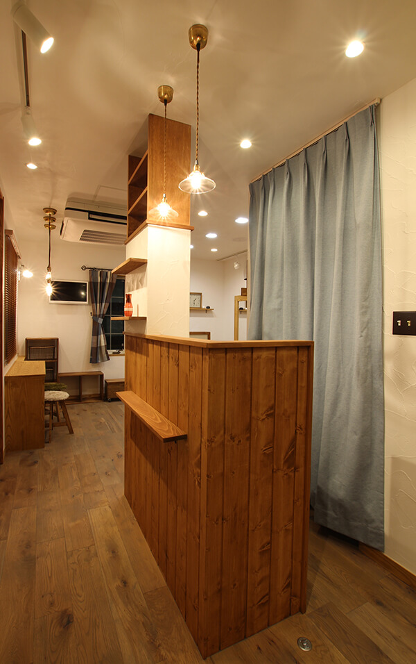 クリア塗装したパイン材やメープル材の床材に、造作材は白を基調にしながらも木目が見えるような塗装にして、メリハリがつきすぎないようにやわらかく、優しく纏めた、シンプルな四角いフォルムの外観に、店舗と二世帯住宅を合わせたお家。