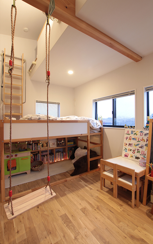 黒いガルバリウムの外壁に、軒を板貼りにした片流れの屋根。男前な外観を抜けてブラックチェリーの玄関を入ると、緑を望むLDKが広がります。 アメリカンサイズの大きなL字のキッチンは、奥さまの一番のこだわり。白い扉に石調の天板、長方形の白いタイルとお気に入りの写真を見ながらオリジナルで作りました。 キッチンから続く高天井のダイニングは、広いウッドデッキにつながり、開放感たっぷり。ダイニング横の板貼り天井のリビングは個室のような落ち着いた空間になりました。 LDKのどこからも緑を望むことができるビューは、必見です。