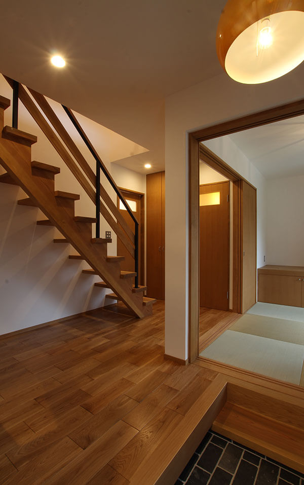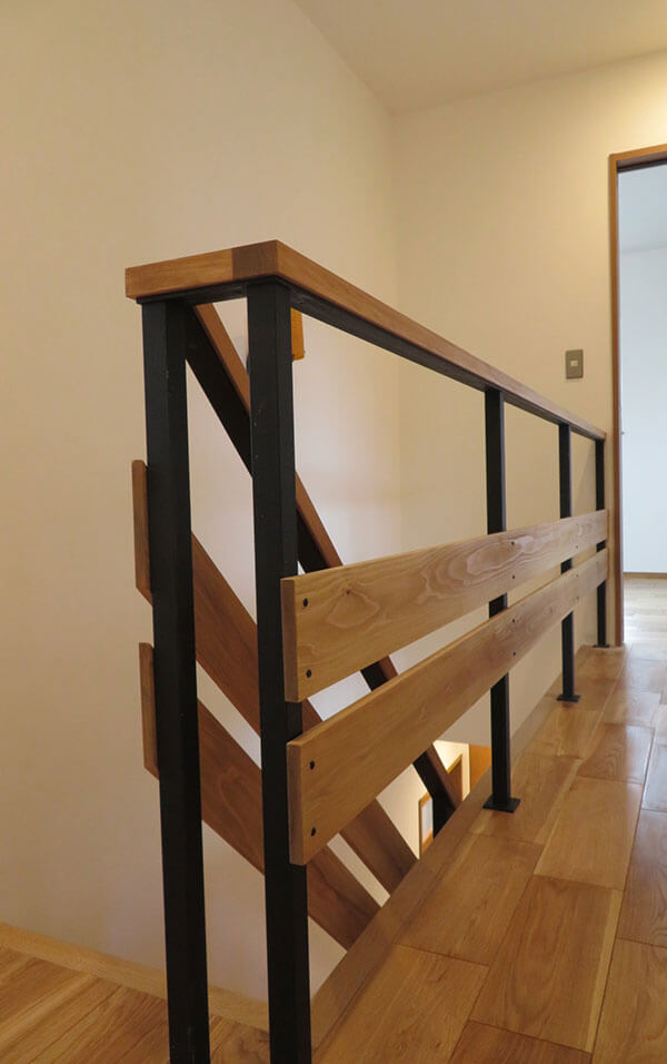 家までの道を歩いていくと、屋根の形にこだわった外観がお出迎え。白いガルバリウムの外壁に、軒裏の板貼りが映えます。玄関を開けると、かっこいい木製のストリップ階段と和室につながる玄関ホールが広がり、 配置にこだわったLDKは、分厚い木材で作った本棚のあるリビング、開放感のあるダイニング、こもれるキッチンと空間と素材の使い方が素敵です。 自然に囲まれた敷地は、室内から緑がたくさん見えて、ゆったりくつろげる空間になりました。