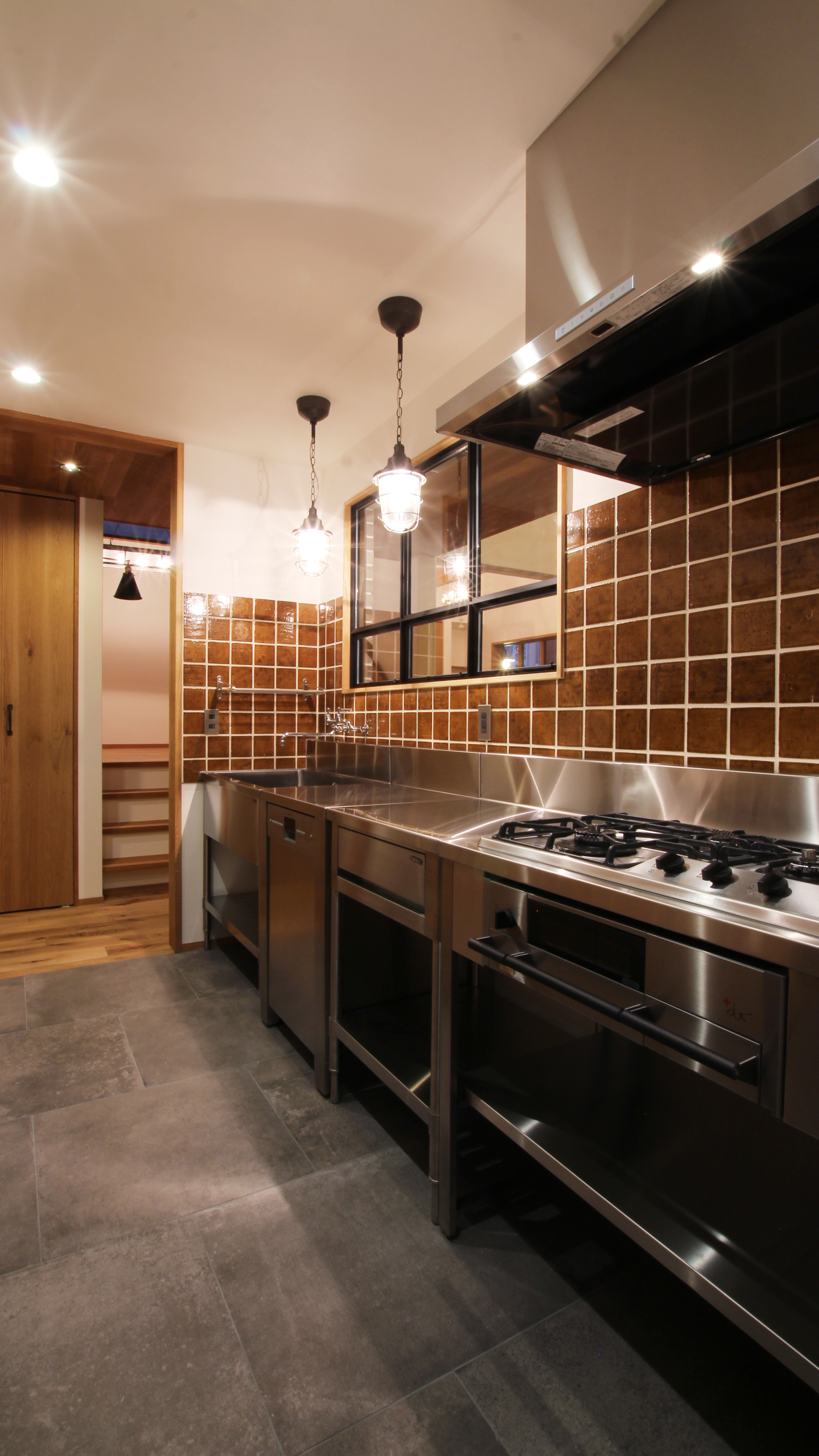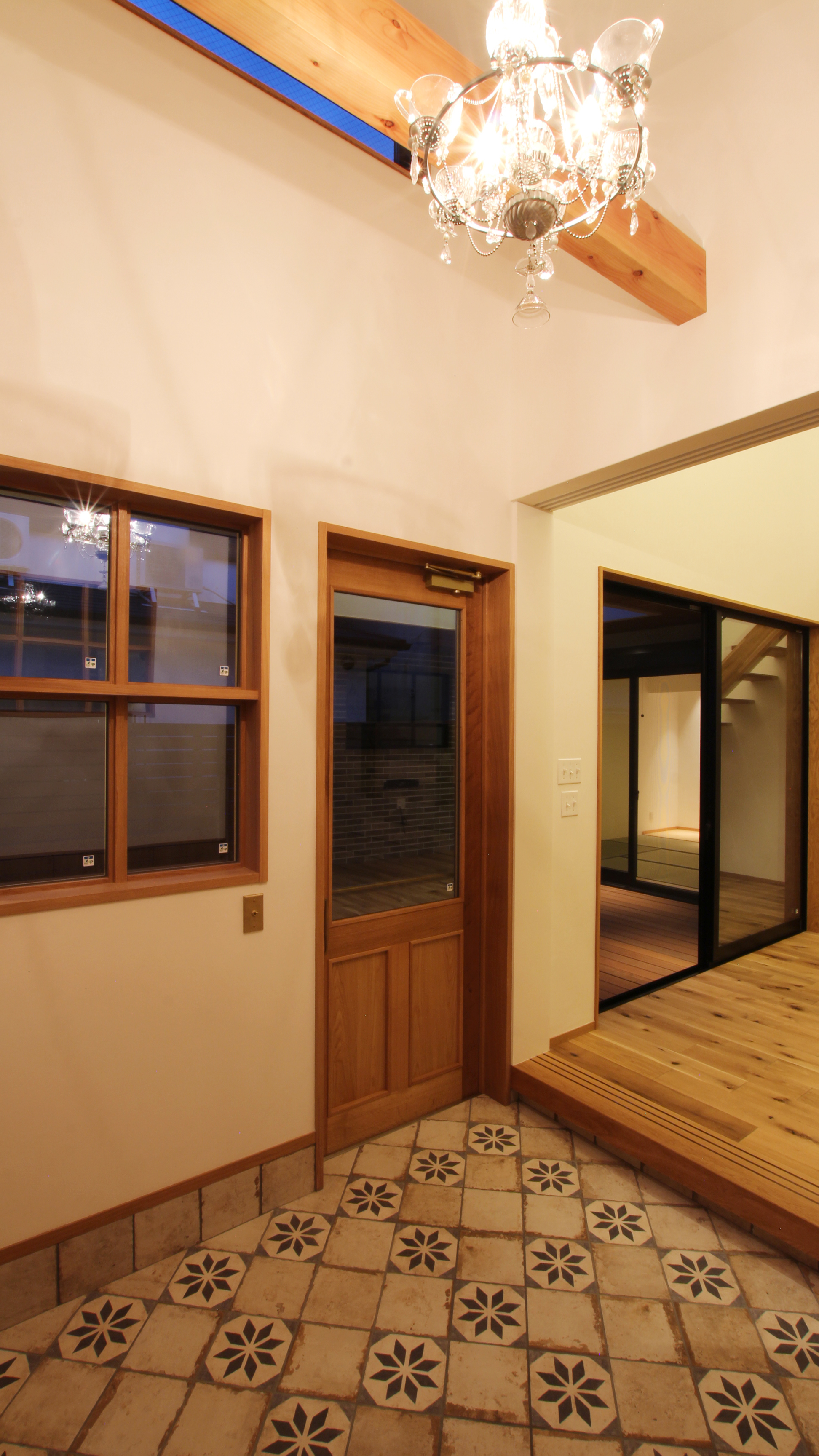 吹抜けのある玄関はオリジナルの木製ドアでお店のような雰囲気に