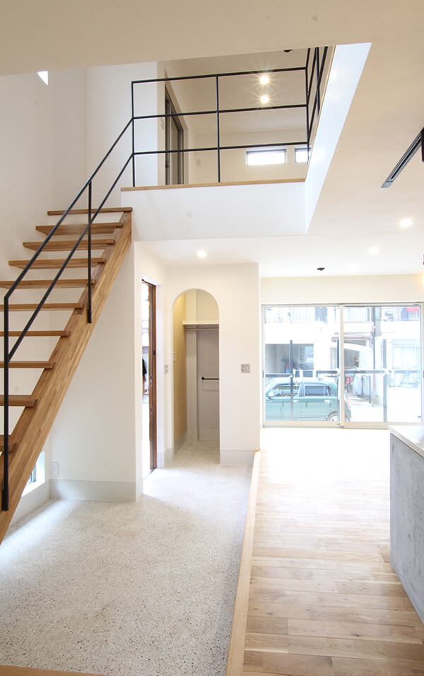 たくさんのこだわりを形にした想いが詰まったお家です。中央に大きな吹抜けを設けた思い切った広々空間はシーリングファンが柔らかく髪を揺らし、ヘリンボーンで組んだ手洗いスペースのタイル壁面は見るだけで心がうずきます。インパクトのあるストリップ階段、白く軽やかな土間の洗い出し、壁に直接取り付けた時計、ハンモックチェアや室内窓とNg様の「好き」がギッシリ詰まった宝石箱のようなお家になりました。