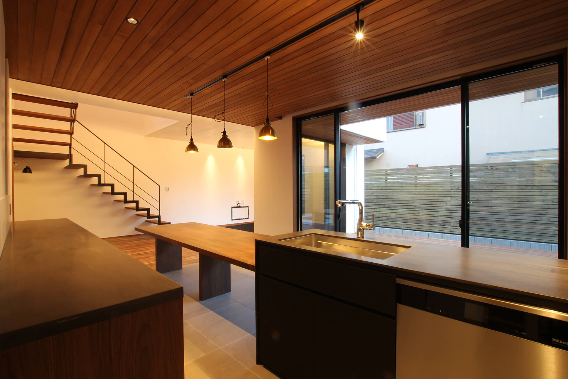 LDKからもエントランスからも中庭が望め、南側の広々としたウッドデッキに囲まれた間取りはゆったりしたサイズ感。しつらえは、ほどよくラグジュアリー感のあるモダンインテリア。 ダウンフロアになったリビング、キッチンはオリジナルで、ブラックウォルナットの無垢材でつくったダイナミックなテーブルとつながったダイニングキッチンは見ごたえ抜群。ビルトインガレージの上には、離れのような独立した書斎もあり、遊び心と上質さを兼ねた魅力たっぷりのお家になりました。