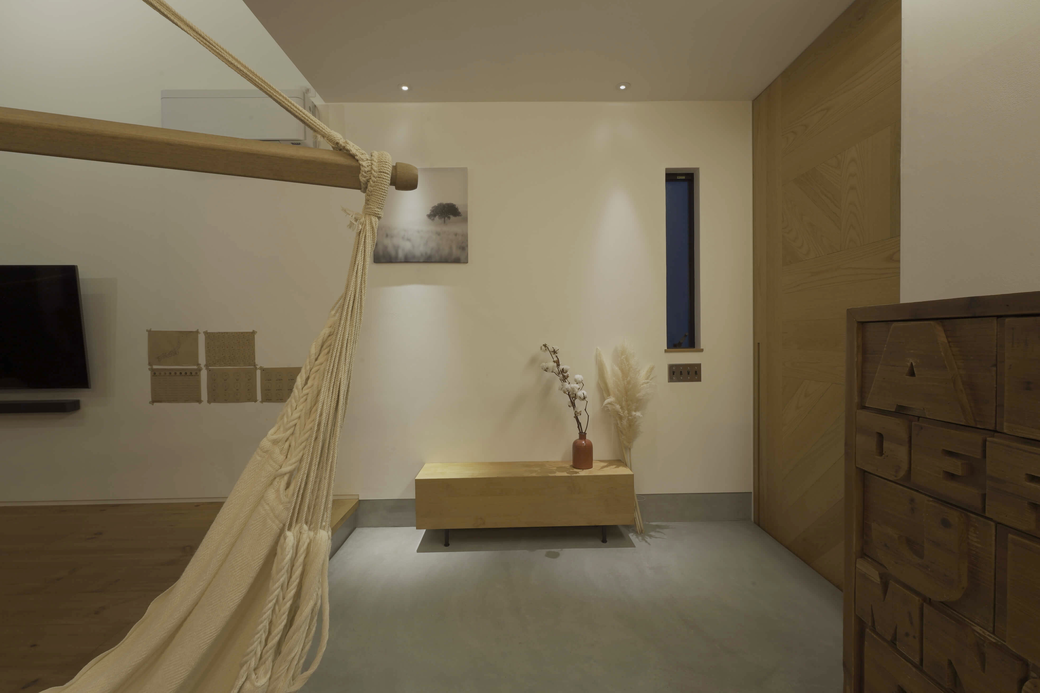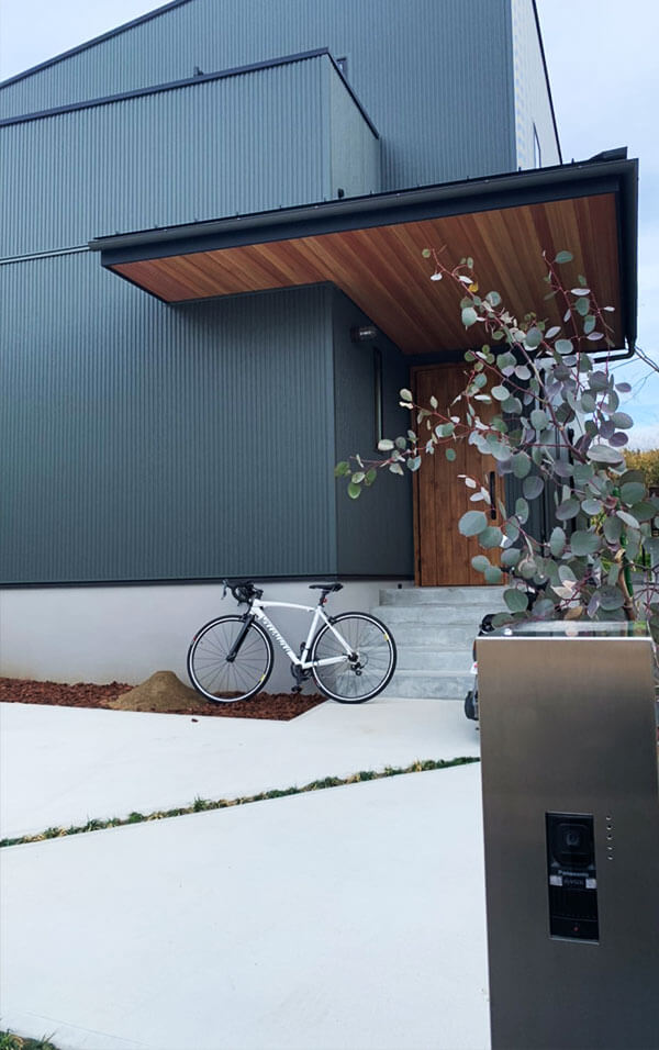 大きくデザインされた木製の引き戸を開けると、土間スペースとリビングがつながり、キッチンの階上にある2階の部屋がそのままつながっています。まるでミニチュアハウスを縦にパカッと開けたドールハウスの断面をそのまま原寸で建てたようなお家。2階のお部屋の大きなRの天井とリビングの吹抜けが勾配天井でつながった空間は、圧巻の抜けを感じられます。平面から高さ要素を考慮する空間の広がりによって心地よさが変わることを実感できます。インテリアは、パインのラフな無垢の床にモルタルグレーの質感が際立つナチュラル感を意識しました。