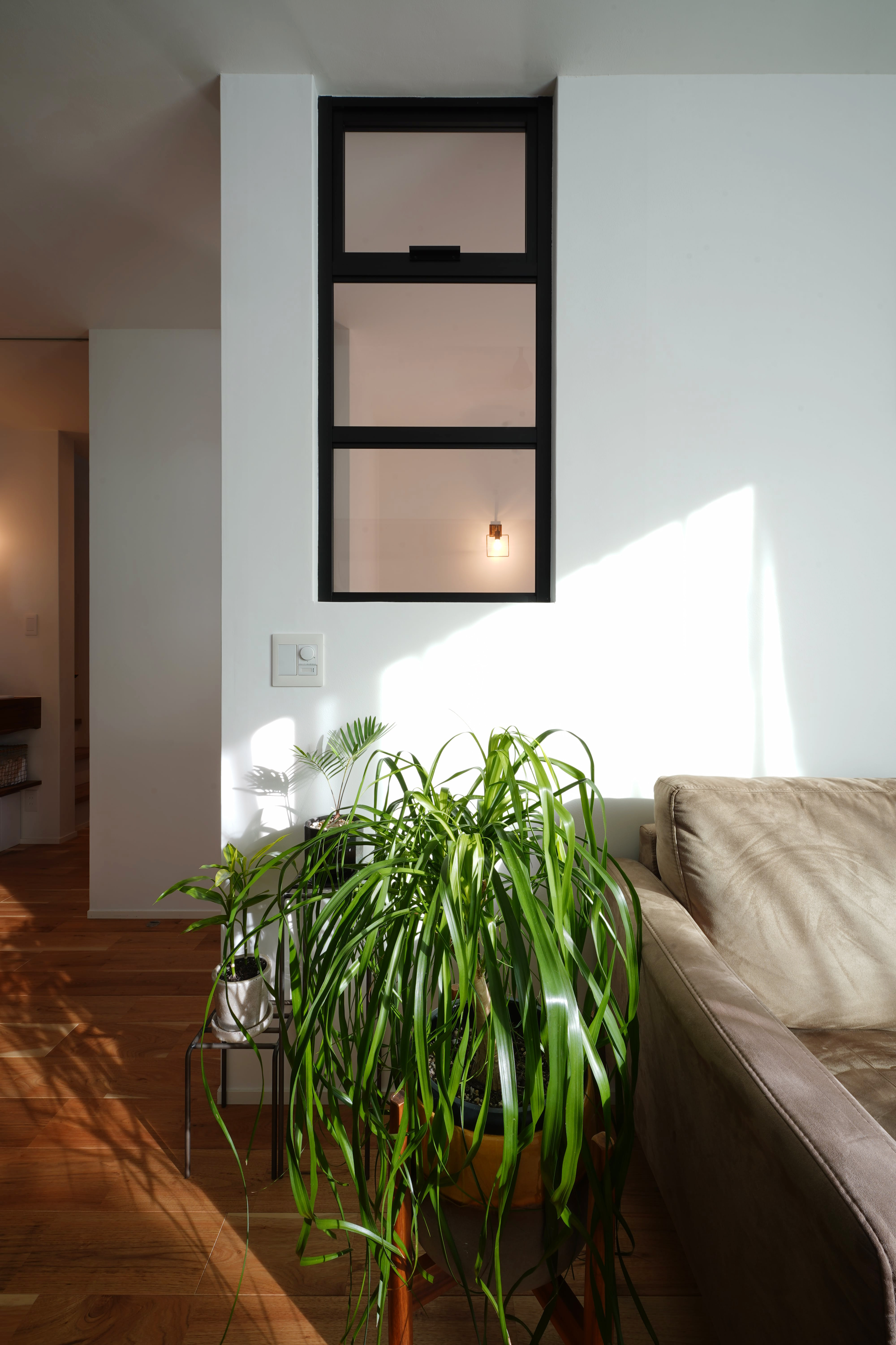 ブラックウォルナットの無垢板と左官をミックスさせたアート感のあるダイニングテーブルや、白太と赤身のダイナミックな木目を使ったキッチン造作。洗面カウンターの天板にも耳付きのチークをそのまま持ってくるなど、木のもつ有機的な天然の表情を大胆にインテリアに使ったお家。床材もラスティックな節目のくるみ材によって、無垢の木ならではのイキイキとした質感をより感じられます。コンパクトな間取りの中で、オーガニックで独創的な素材感をぎゅっと詰め込んだお家になりました。
