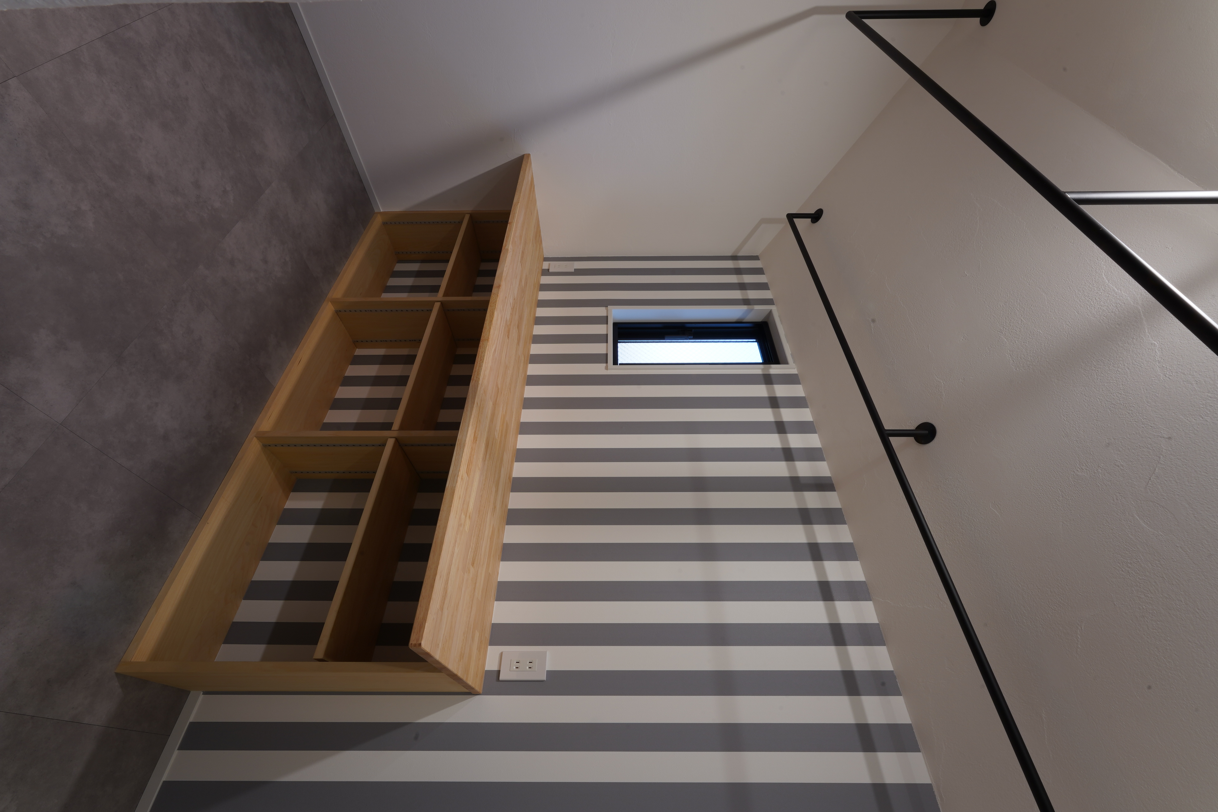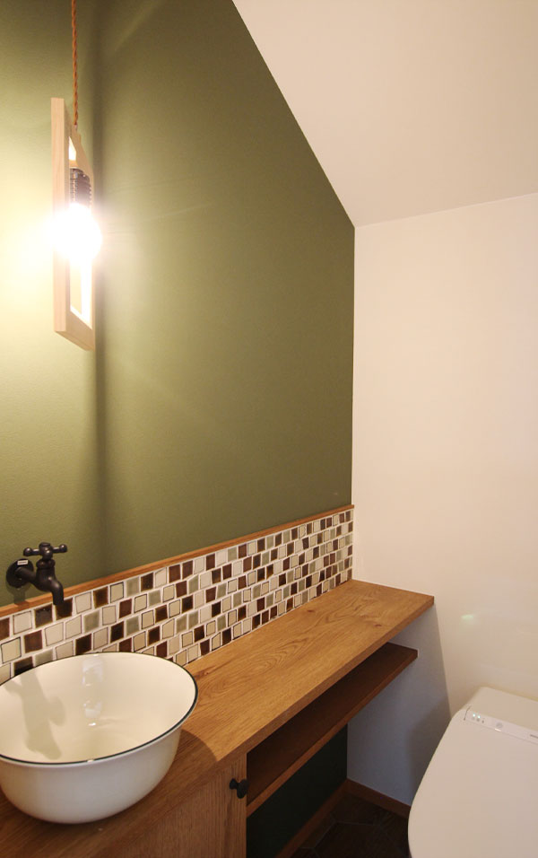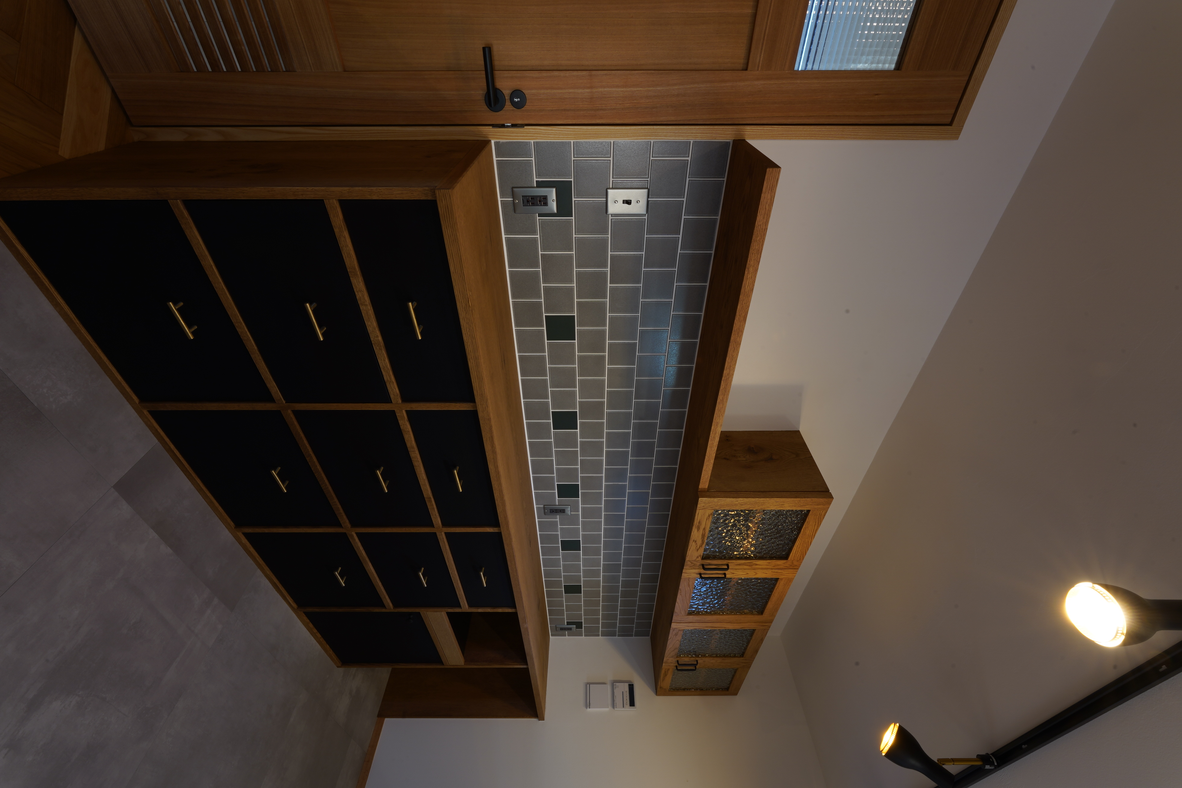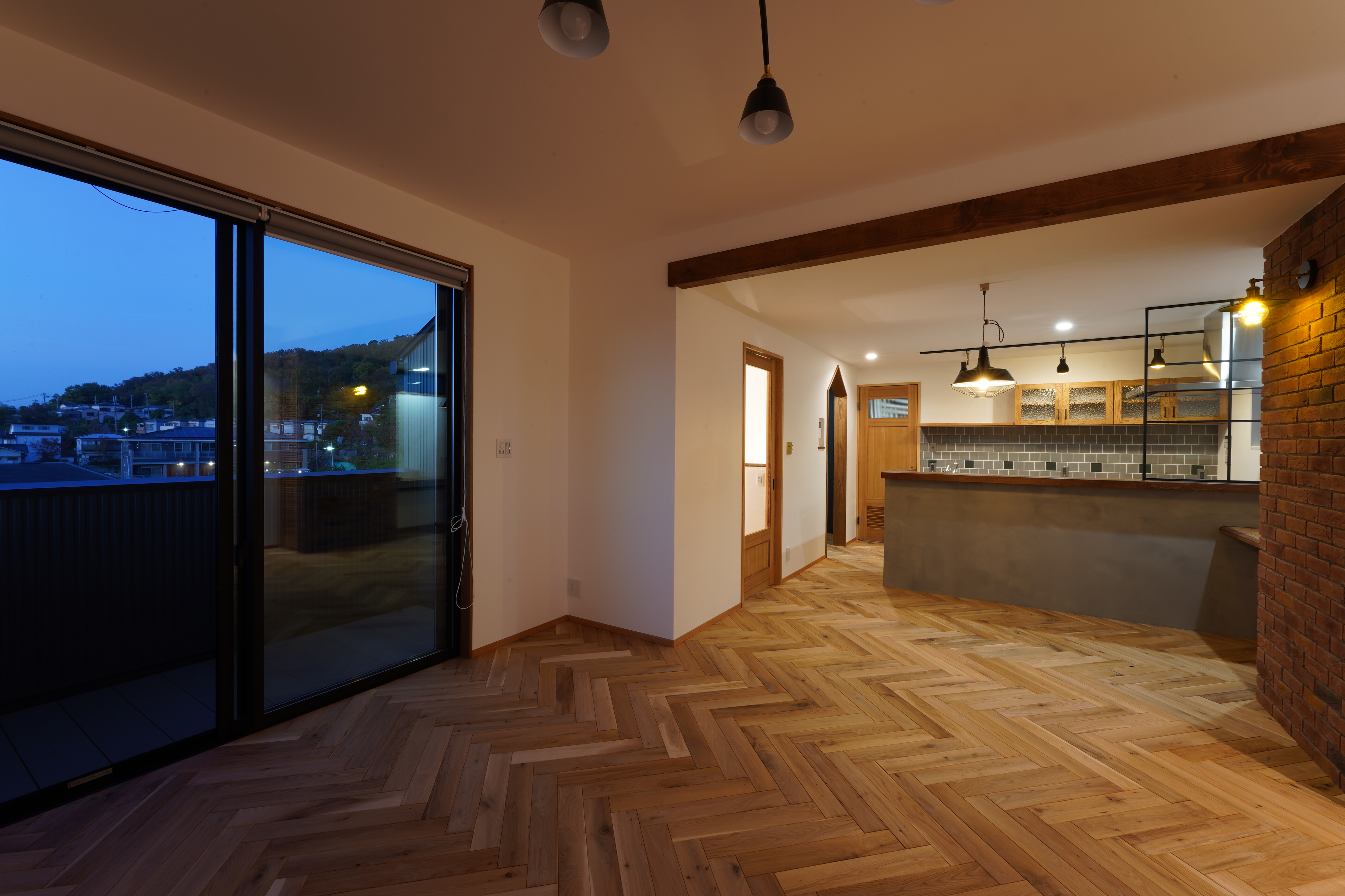 山の麓に建つT様邸は2階のリビングの装飾された窓からは大阪の街を見渡せます。外観は緑のガルバにレッドシダーの板貼りでカッコよく、内観はブルックリンテイストにまとめ、見た目も機能面もこだわりの詰まったお家になりました。LDKに入るとまず目を惹くレンガ貼りの壁。壁の裏側にはたっぷりの収納スペースが完備されています。 古材とモルタルで作ったキッチンの腰壁、アイアンのオイルガードもブルックリンの雰囲気を醸し出してくれます。このお家のメインとなるヘリンボーンの床はお施主様たっての希望で大胆にLDK全体に採用しました。