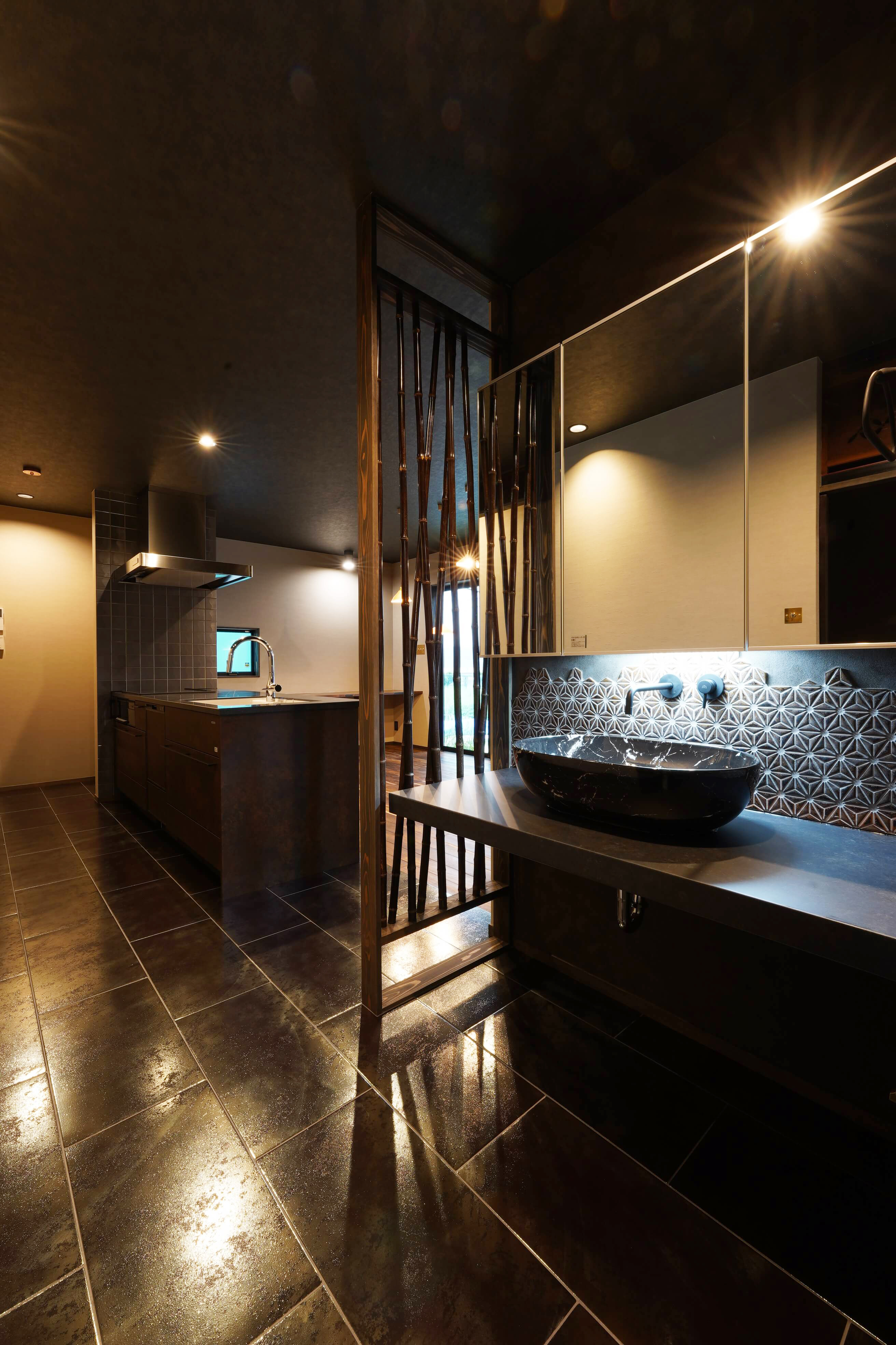 1階は和風空間をメインに、2階は現代アート的な空間をメインテーマに、全体的に落ち着いた趣のある空間に仕上がっています。 玄関は飛び石のようにモルタルへ石材を埋め込んだり、アンティークの扉を間仕切り壁として使用して旅館のようなお出迎え空間になりました。リビングには畳を敷き込んで和室リビングとしたり、欄間や竹を使ったパーテーションなどこだわりがたくさんつまっています。ペンダント照明やスイッチなど、器具にもこだわっていただきましたし、間接照明やダウンライトの配灯は単調にならないように工夫しています。 和風だけでは言い表せられない、素敵空間です。