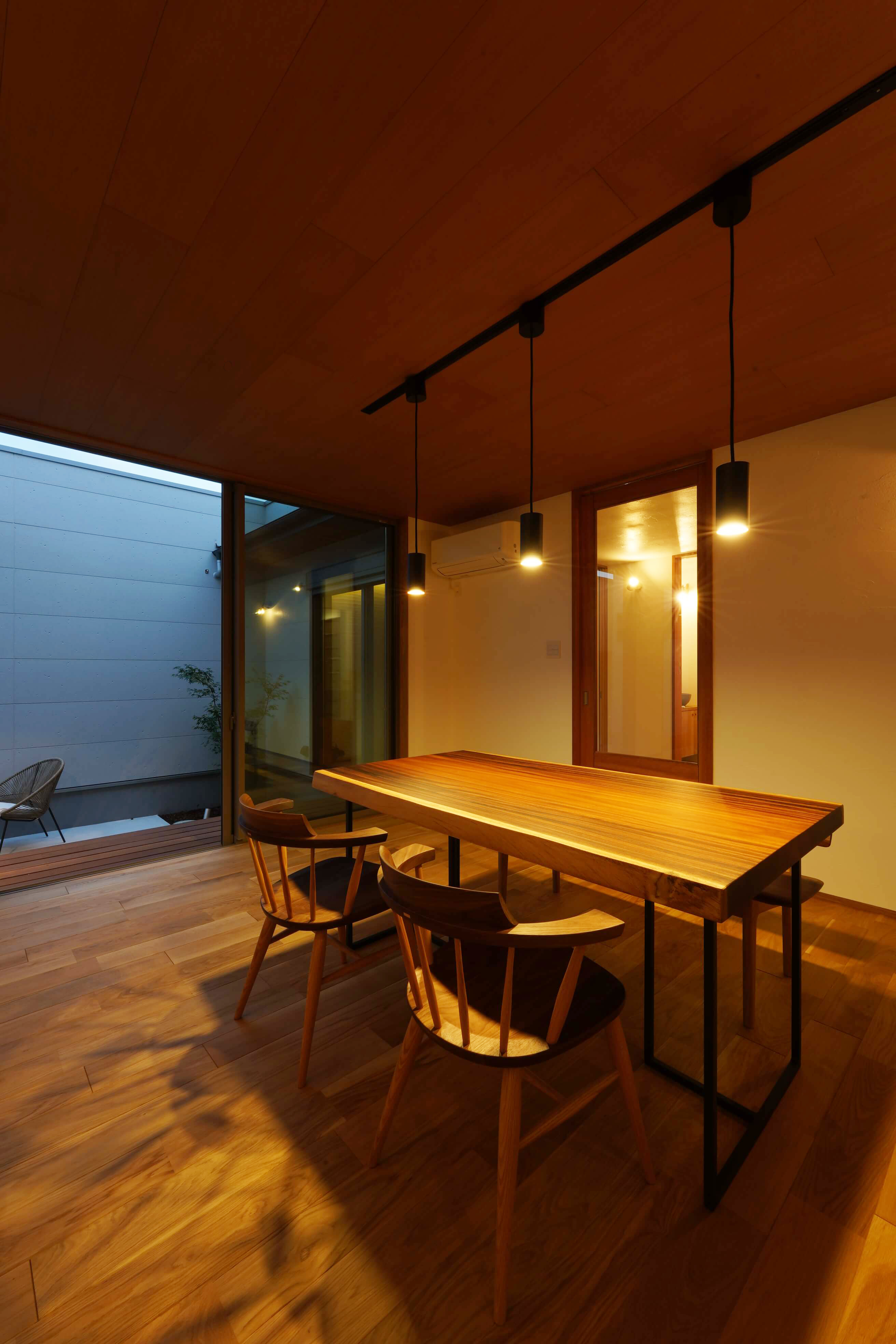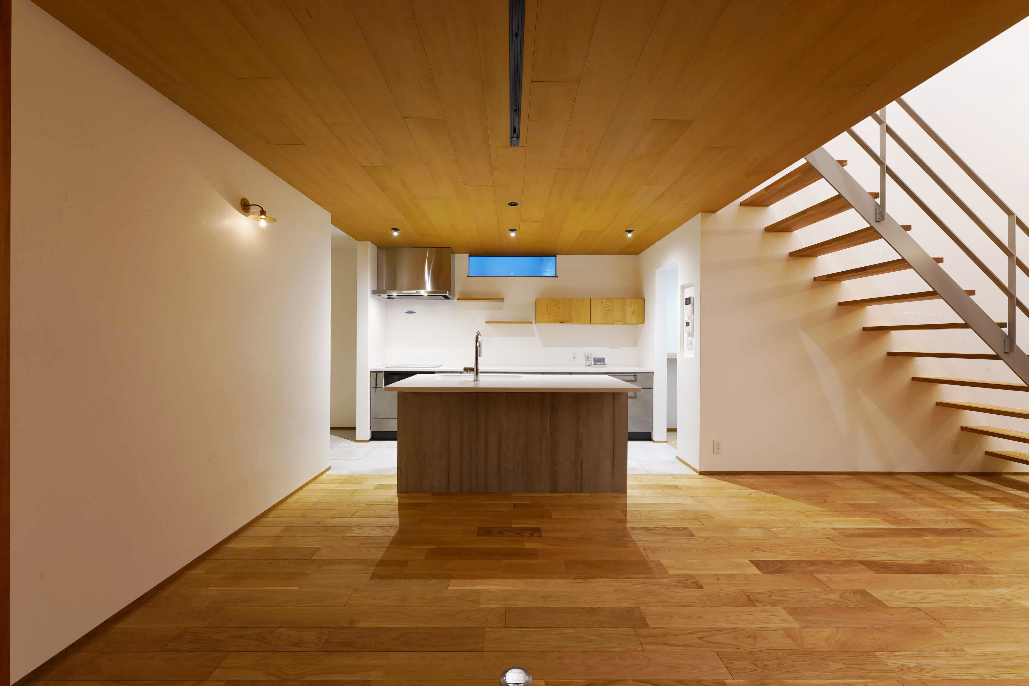 ダイニングキッチンと大きな吹抜けのあるリビングに面して、外壁に囲まれた広い中庭を備え、平面的にも高さ的にも抜けが大きく、圧倒的な広がりのあるお家。 玄関もホールから和室がつながり、こちらも視覚的な広がりのあるスペースになっています。外壁に鎧貼りのソリドで仕上げた外観の見栄えも抜群の間口の広い立地。 オークの無垢の床材を使い、リビングにはアカシアの個性ある木目の板貼りを採用して、LDKに入った瞬間のアイキャッチになりました。豊かな空間構成にインテリアの見どころも要所でちりばめたシンプルナチュラルなお家です。