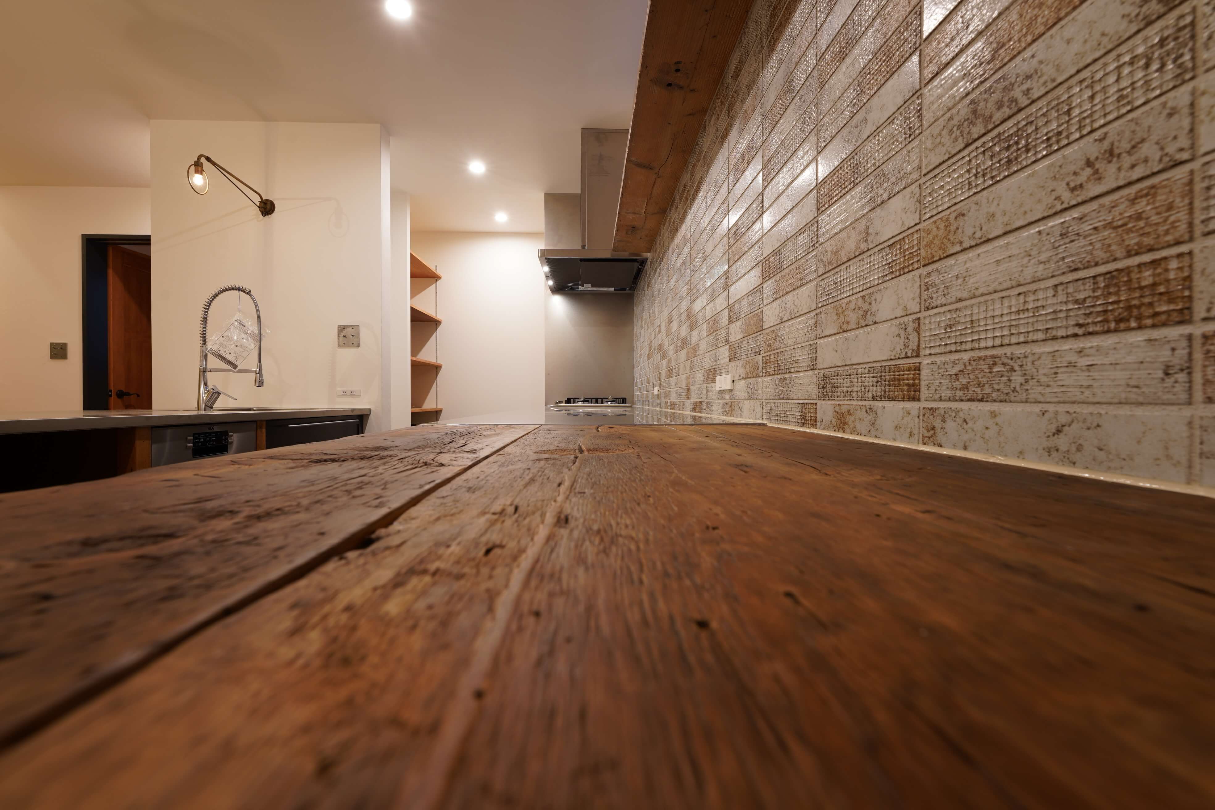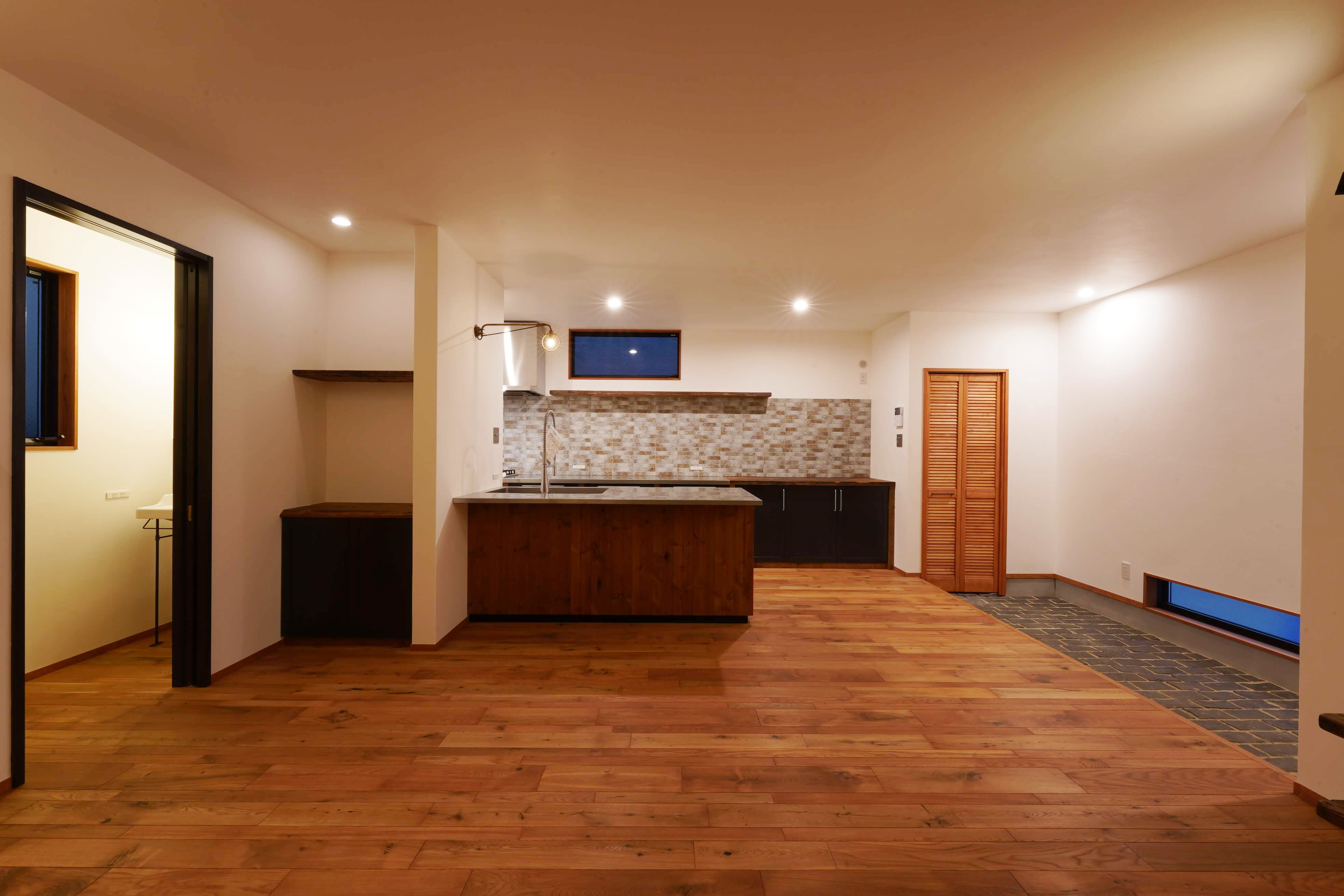 ピンコロ敷きの玄関土間と、リビング、キッチンダイニングがつながったワンルームスタイルのお家。暮らす家族との距離感が居心地よさを感じられる広さのお家です。幅も長さも違う乱尺のオークの無垢の床材がベーシックに個性を立たせつつ、古材やサーモパイン材を使ったオリジナルのキッチンはラフな木のもつ素材感を十分感じられる仕上りで、インテリアの主役にもなっています。2階のお部屋のひとつがスキップフロアになって、高天井のリビングで抜けも感じられると思います。