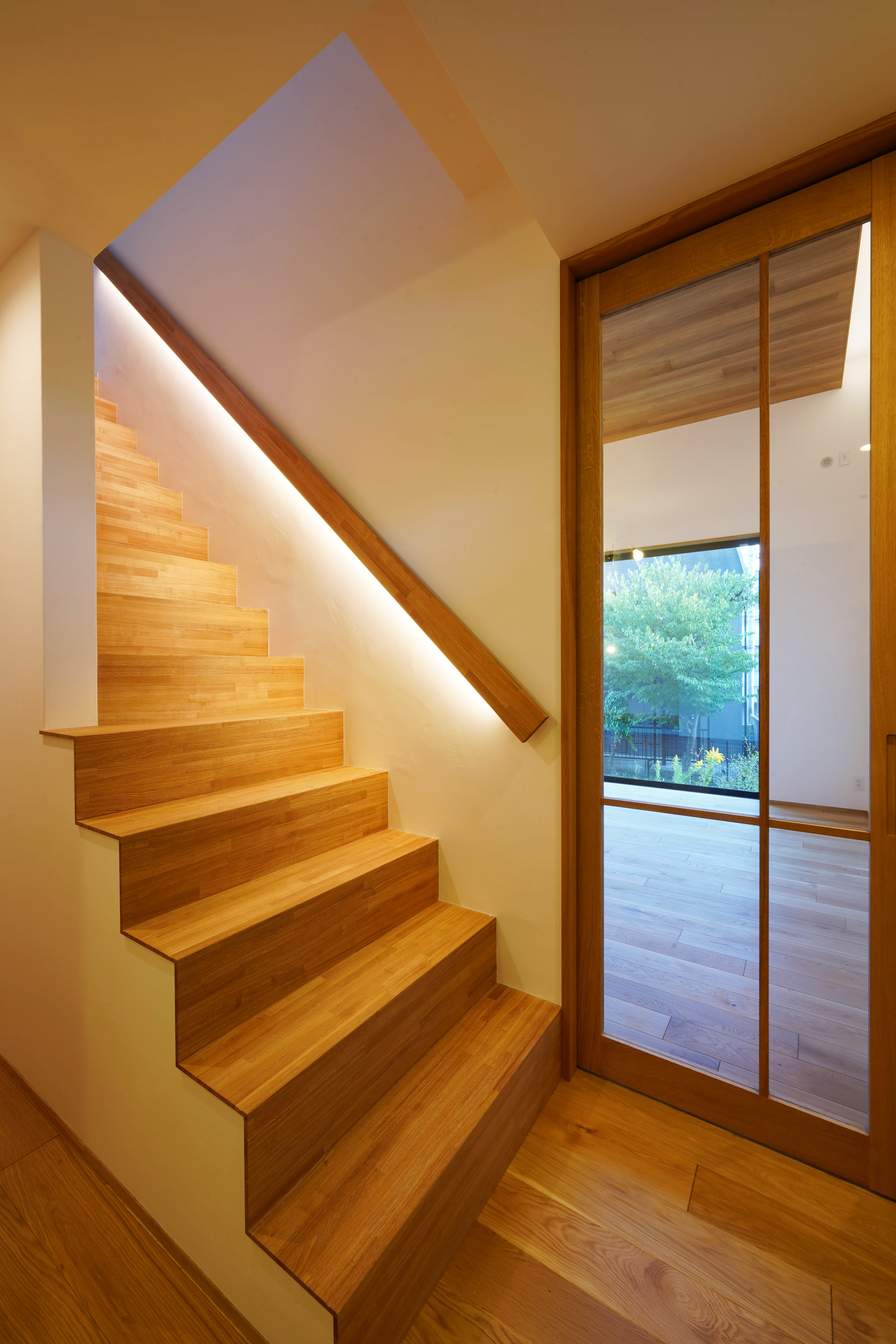 外は黒のガルバリウムの外壁とレッドシダーの軒板という男前な外観ですが、インテリアはグレイッシュな色合いとオークのナチュラルな木質感が組み合わさって、どこか中性的で柔和な印象のあるお家です。リビングの高天井によって、明るく床面積以上の広がりも感じられるLDKなりました。