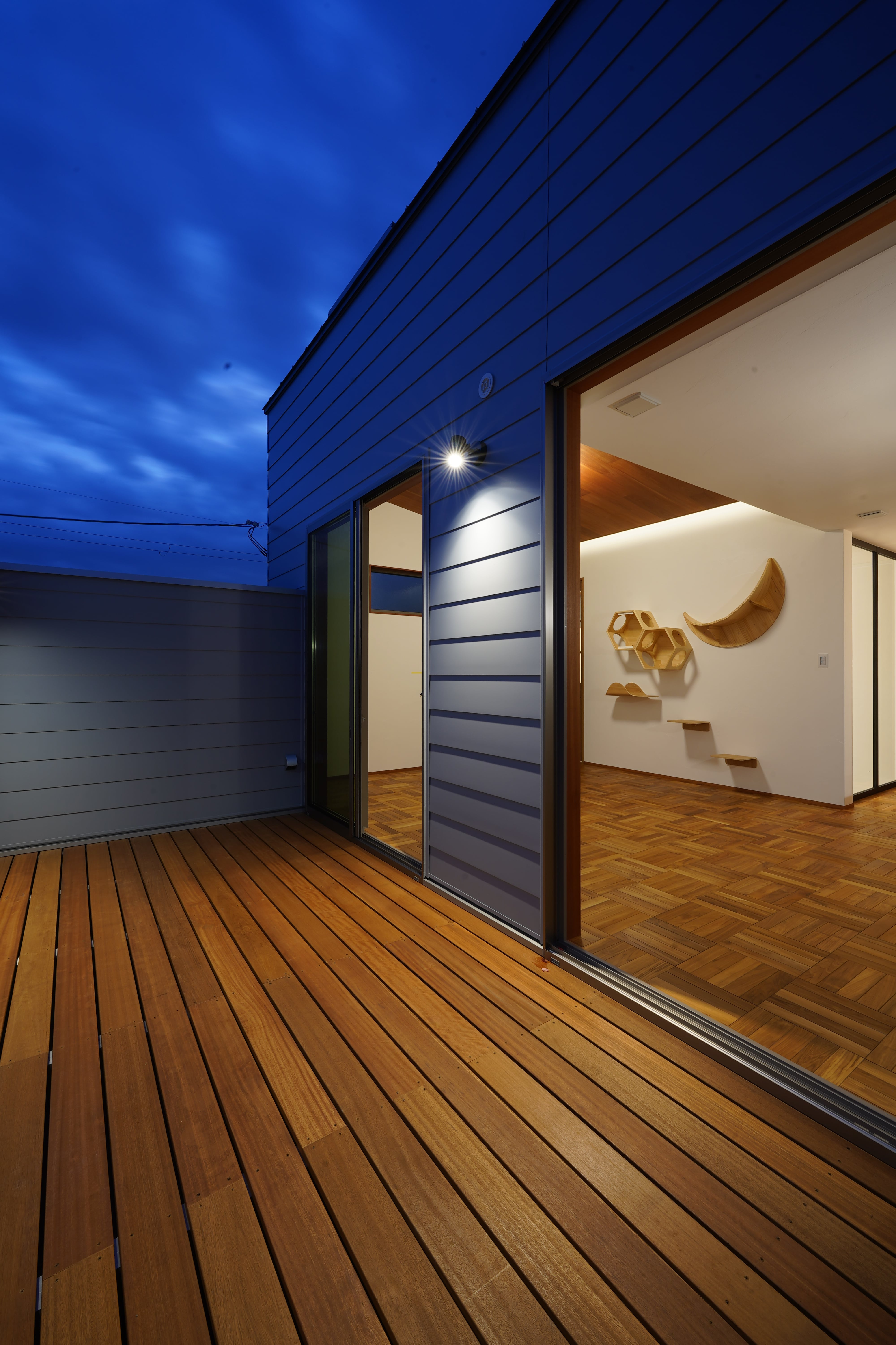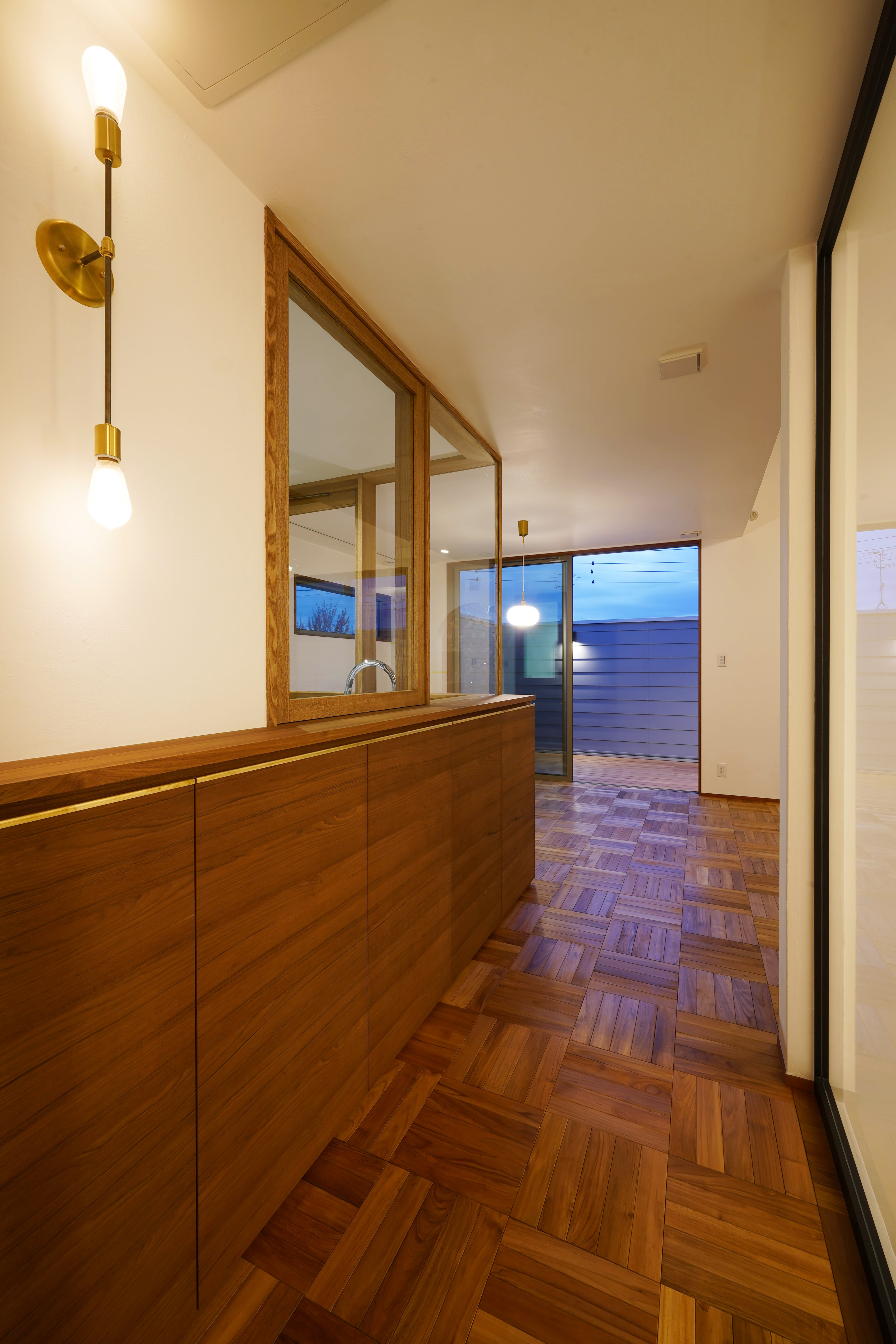 北欧ヴィンテージの世界観×お客さんこだわりの遊び心の融合によってオリジナル感のあるお家がまたひとつできました。2階リビングダイニングの無垢チークのパーケット床には、どんな樹種の床材にもできない華やかなインテリアの世界観を映す力強さがあります。玄関から吹抜けへと真っ直ぐ昇っていく階段もまた印象的な存在であり、その階段の手摺はお客さん自作のアイアン手摺ということも、このお家のハイライトのひとつです。