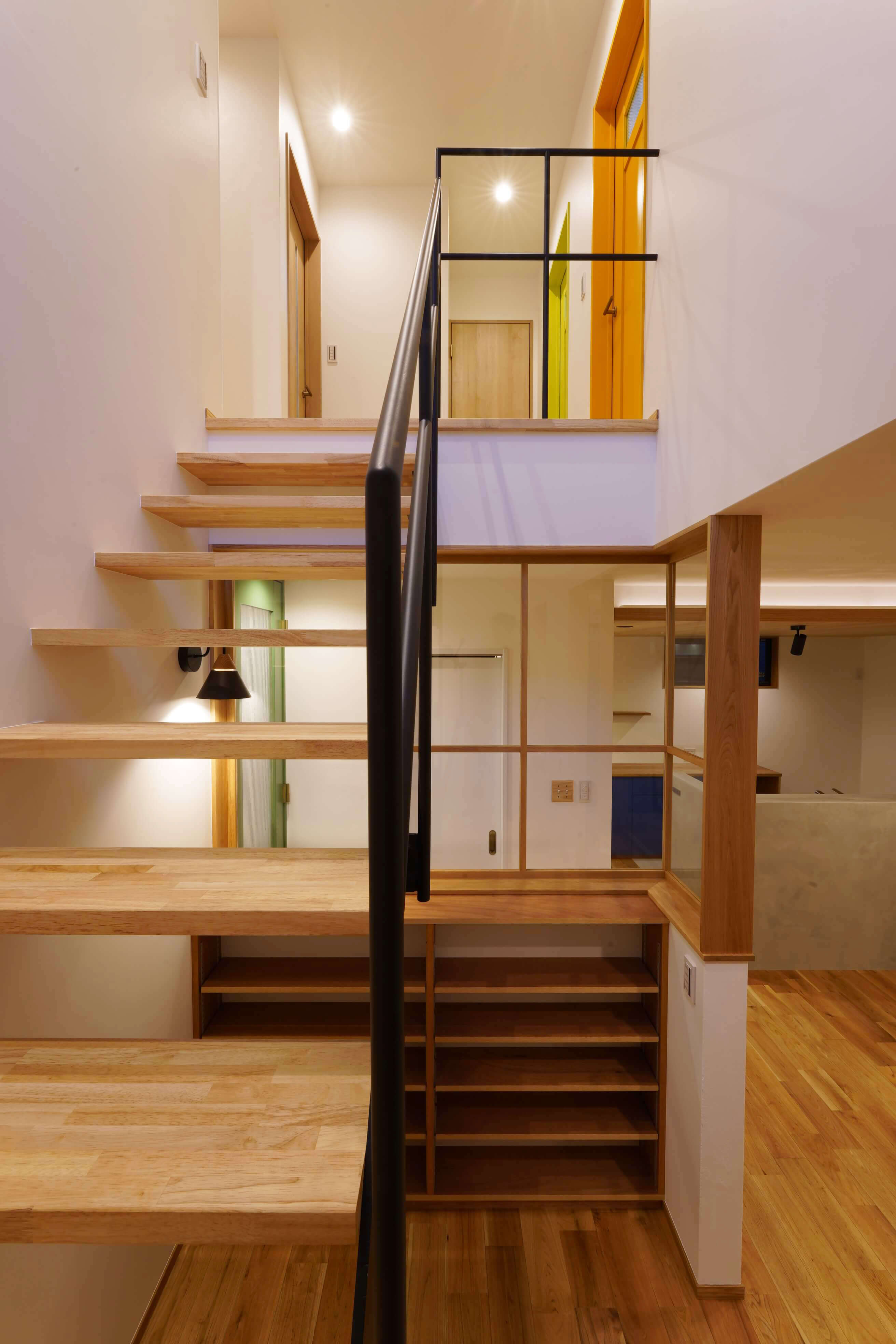 以前ハナハウスで働いていたスタッフのアドバイスでハナハウスに来てくれたМさん。当初、僕たちは特にこだわりはないんです…と言っていたのが嘘のように、最終的にはあれやこれやと盛り込まれた家になりました。時間をかけたのは間取りです。いかに効率よく家事や子育てをするのかということをテーマに玄関→シューズクローゼット→洗面(→物干)→ファミリークローゼットといった動線を練りに練り、遊び空間として読書スペースとウッドデッキのつながりを大事にしました。デザインは階段室に備えた本棚と室内窓、キッチンは腰壁のモールテックスと天井の板貼り、カラフルなドアなどナチュラルだけど格好良さも備えたものになっています。Мさんには土地探しや贈与のことなどいろんな相談をしていただきました。でも一番印象に残っているのはちょっとした一言。とってもまじめな性格のお2人ですがユーモアがあり、時々社長や僕を「いじって」笑ってくれました。Мさん先日はプチ仕事させていただきました。その時も社長をいじっていただきありがとうございます。そんなやり取りが末長く続くことを願っております。