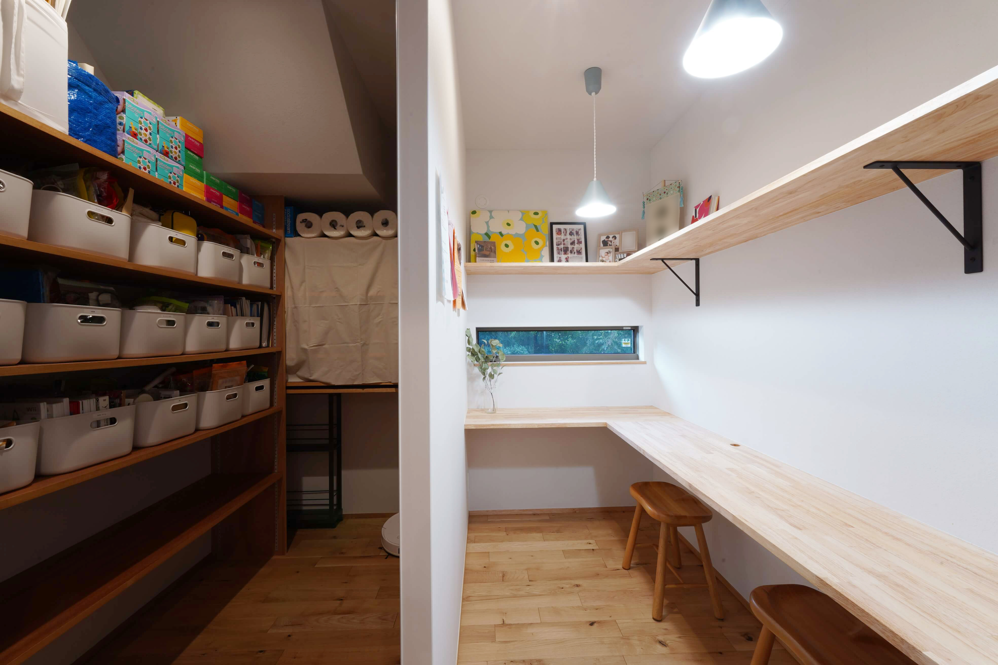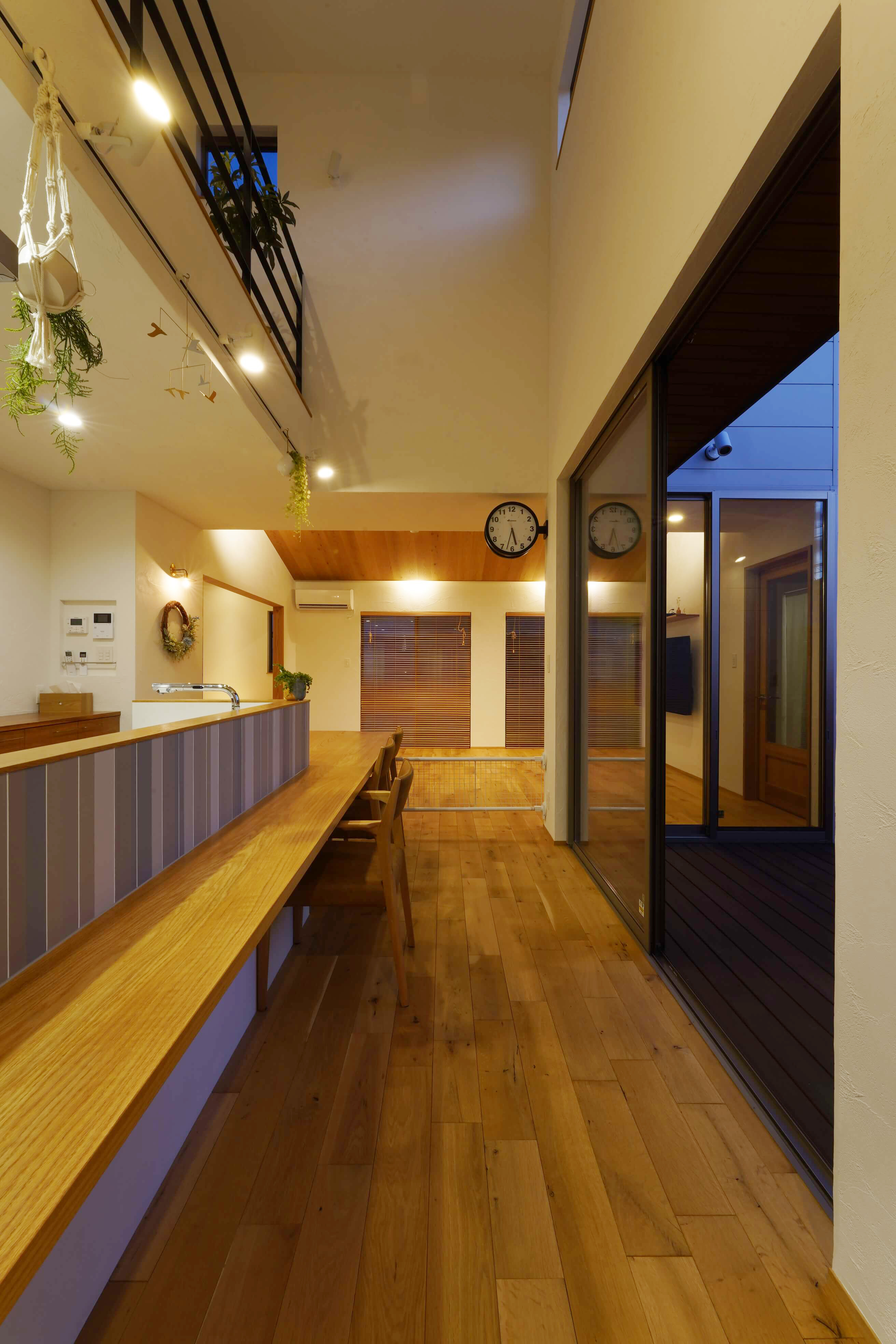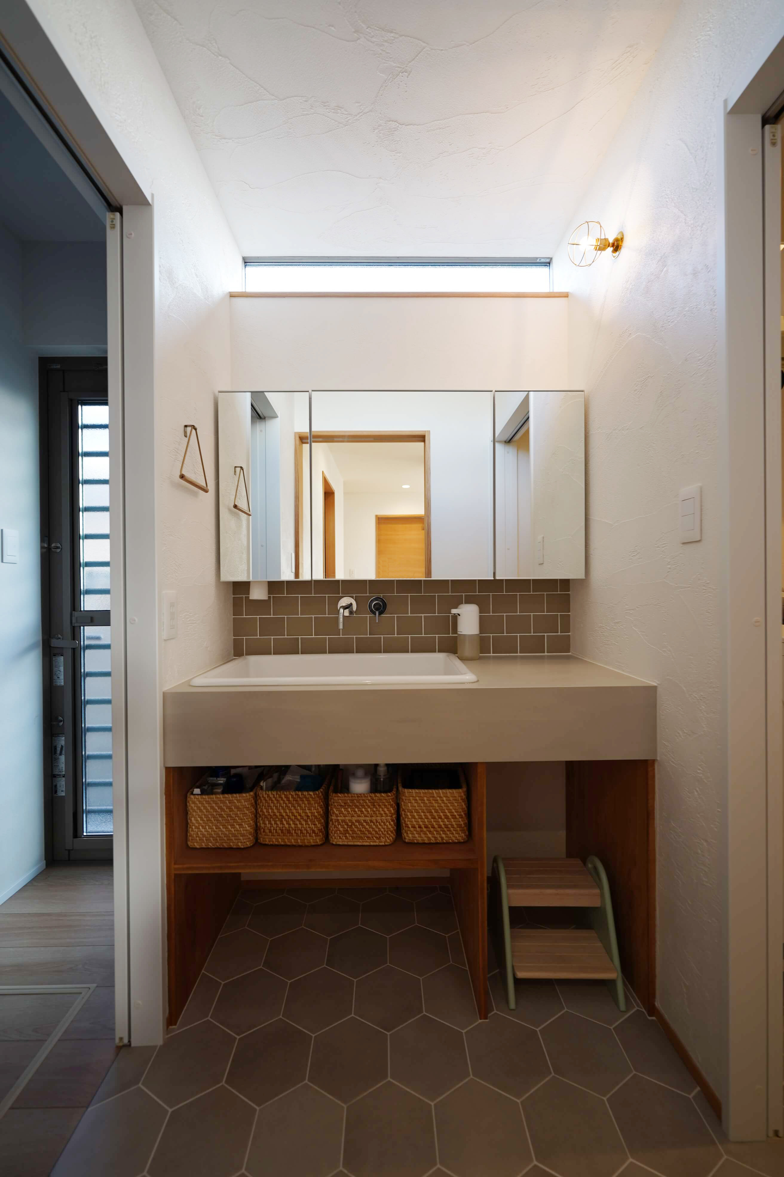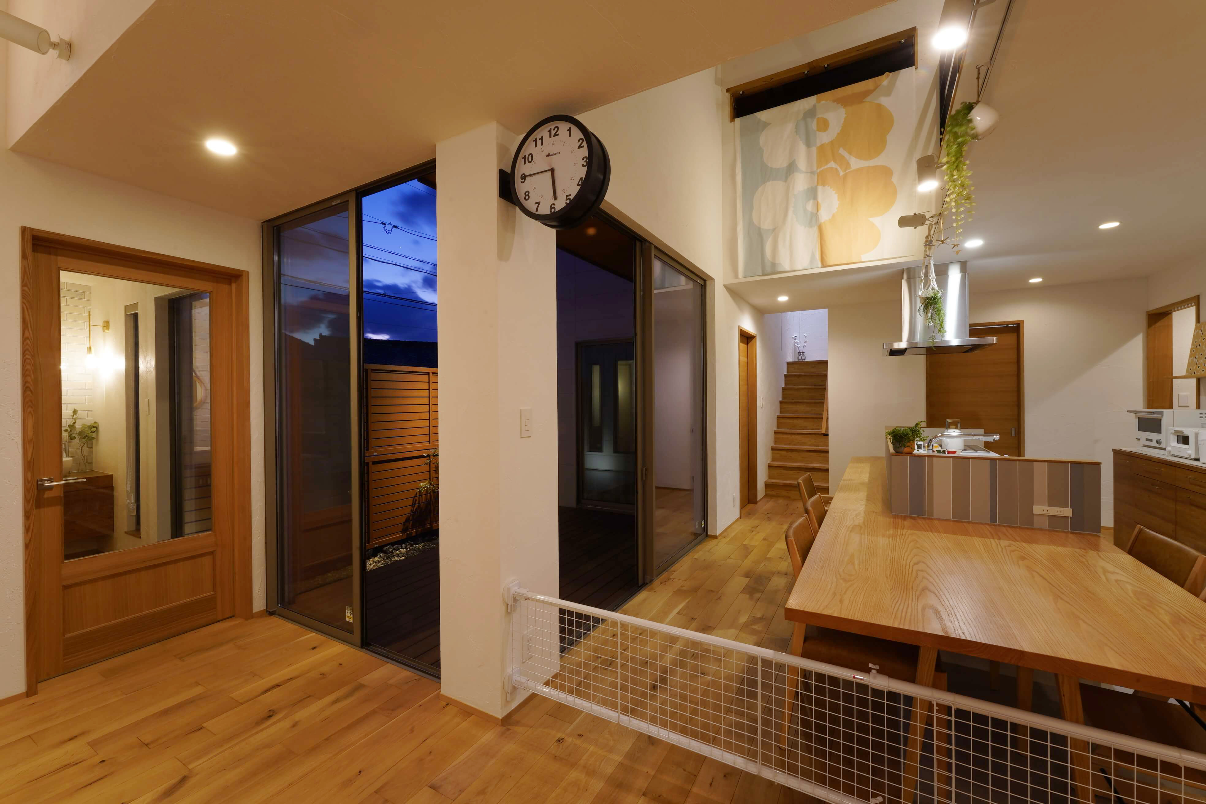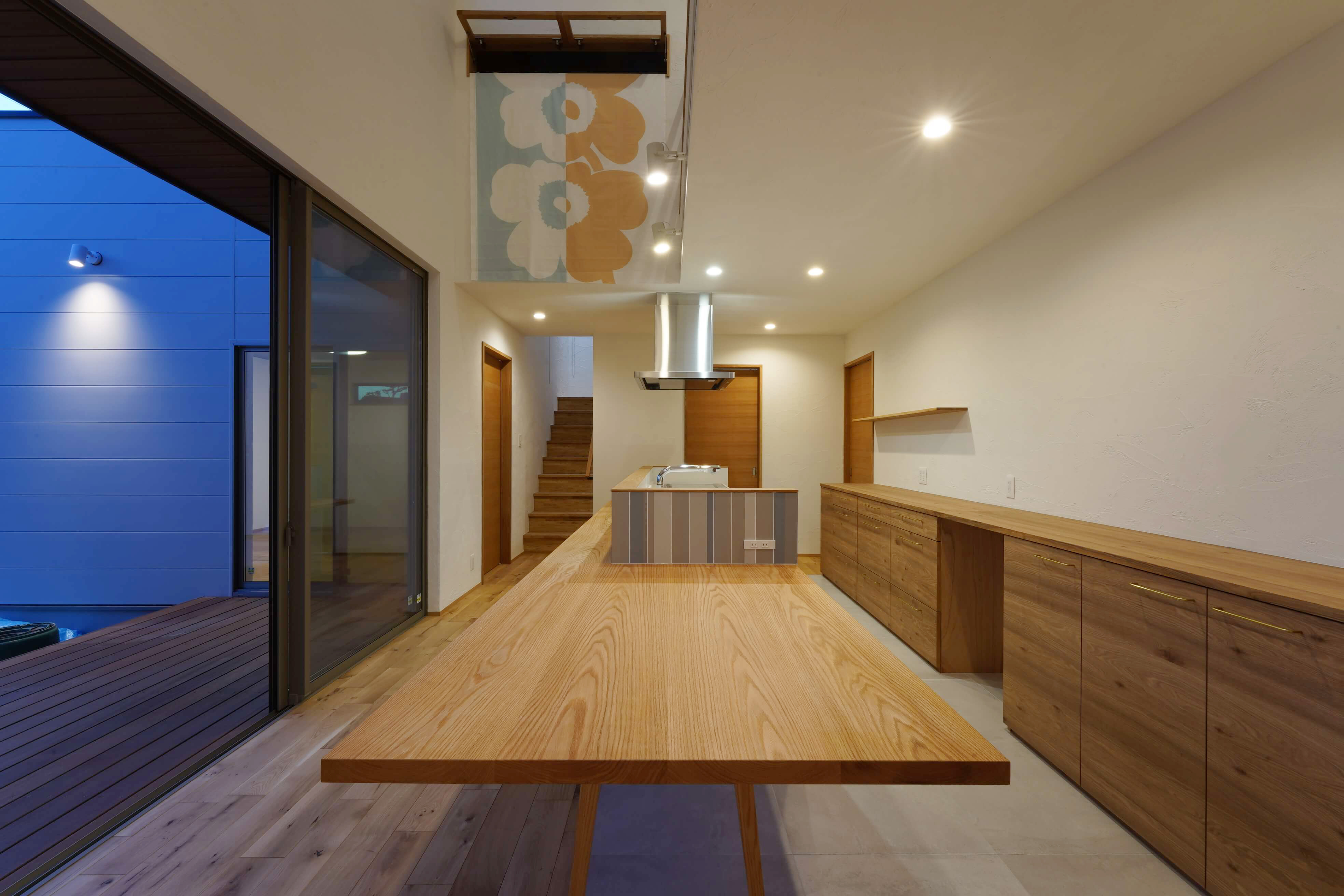 玄関、LDK、そして寝室からも中庭が望める間取りになっていて、ほぼ平屋のような感覚の2階建てのお家。広々とした勾配天井のリビングと吹抜けで2階とつながったダイニングキッチン。ゆったりとした豊かな空間と、内と外につながりを持った清潔感のあるそして、無垢の木と漆喰と印象的ながらニュートラルさも感じるタイル使いで、素材感をきちんと感じられる居心地の良いお家になりました。奥さんが大好きなマリメッコのファブリックの大きなタペストリーを掛けられるようにと、吹抜け壁に室内窓を設けています。好きなインテリアと一緒にのんびりとした暮らしを描ける、そんなお家です。
