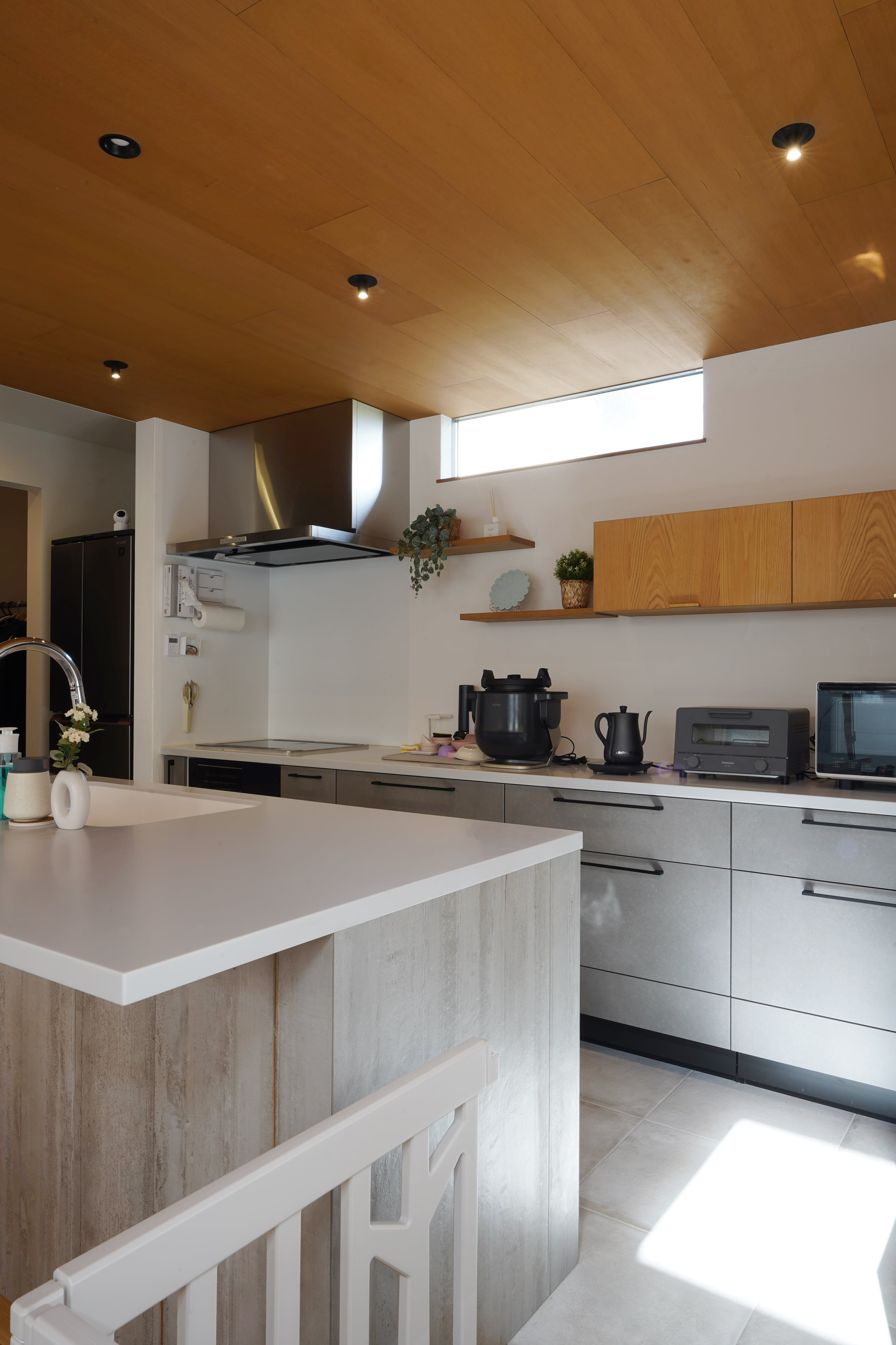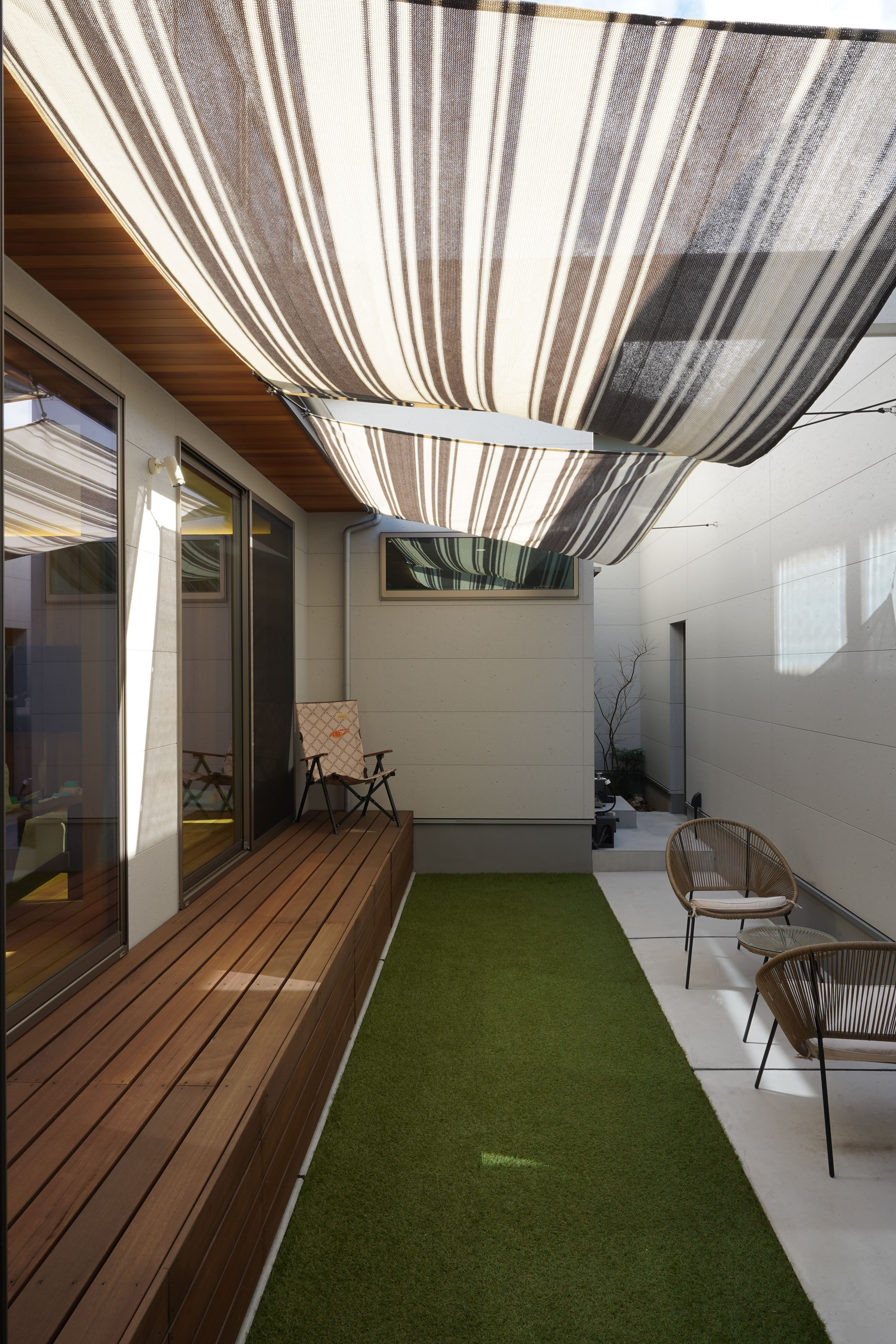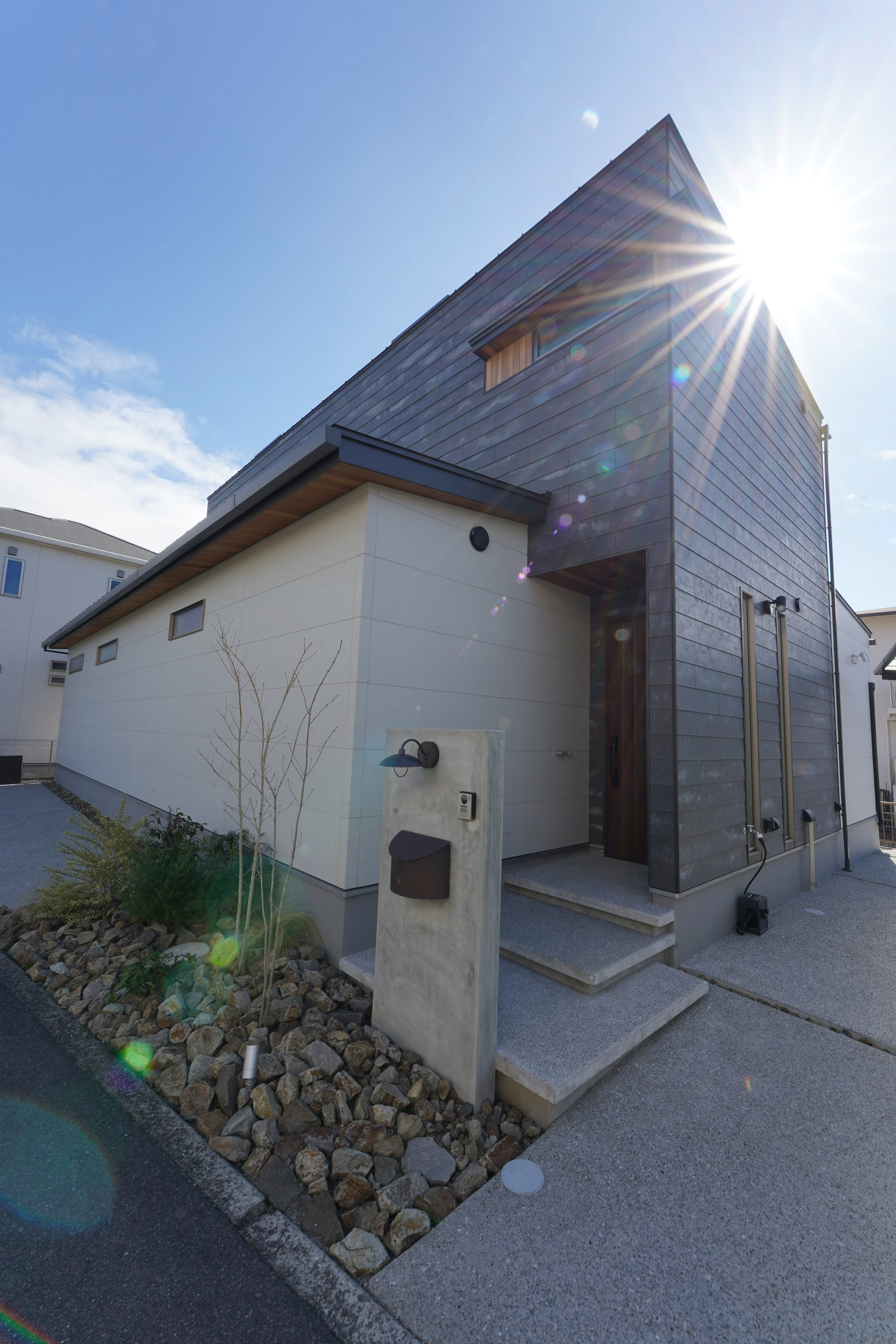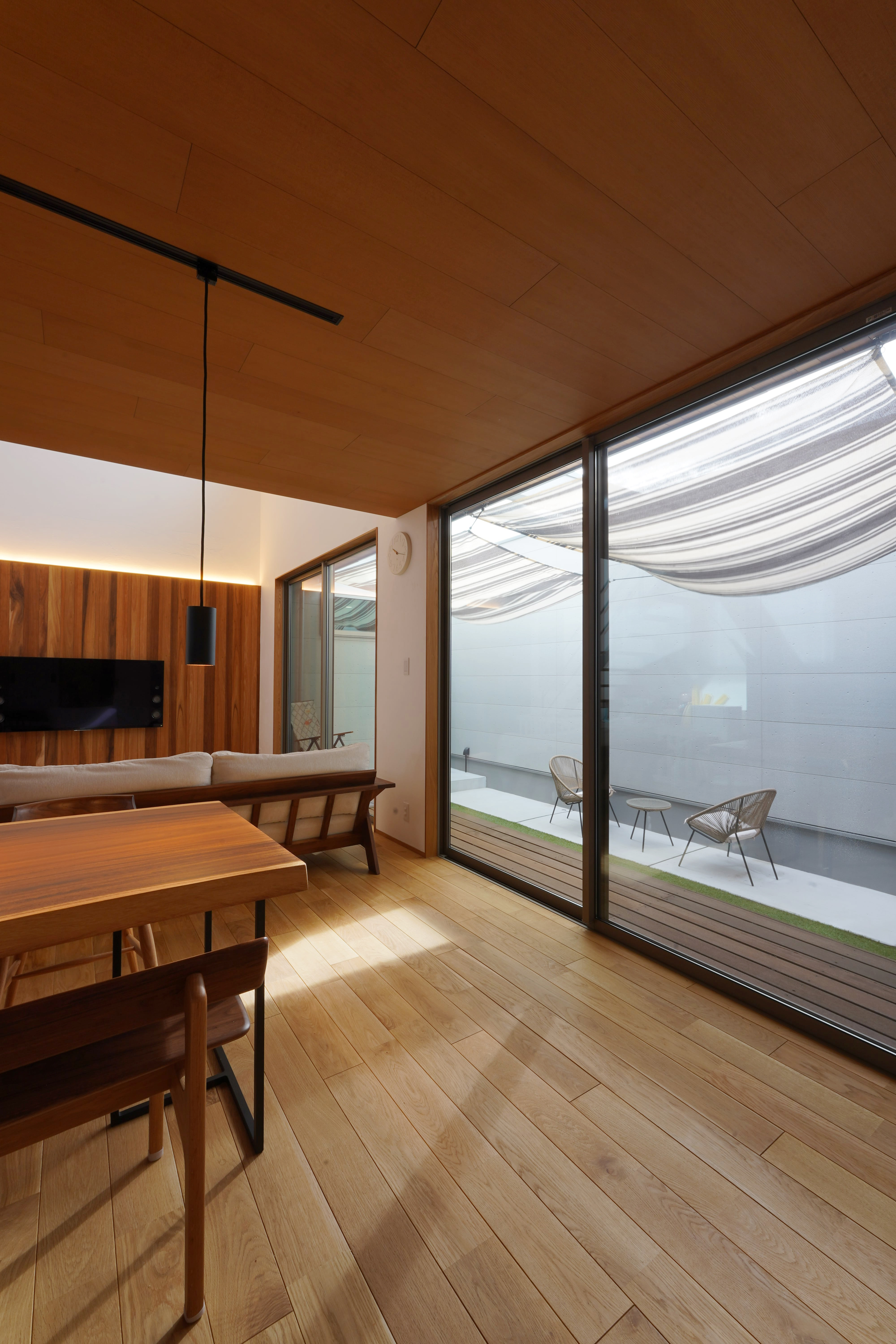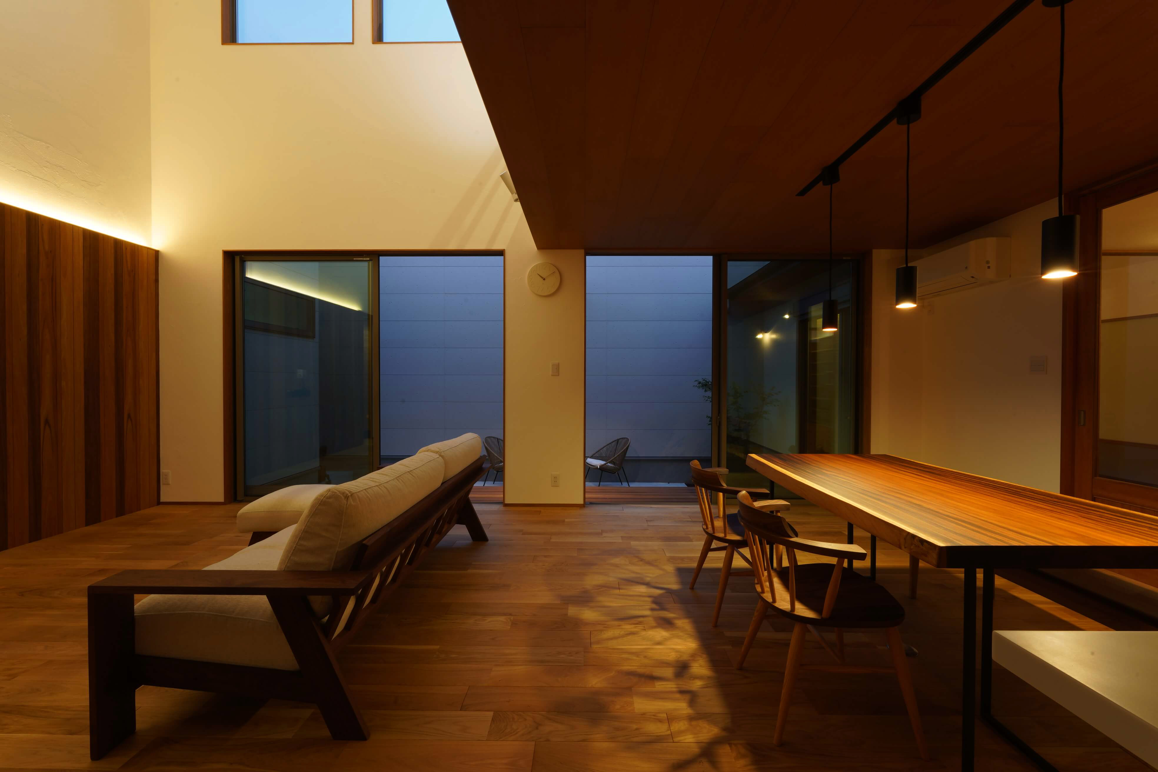 ダイニングキッチンと大きな吹抜けのあるリビングに面して、外壁に囲まれた広い中庭を備え、平面的にも高さ的にも抜けが大きく、圧倒的な広がりのあるお家。 玄関もホールから和室がつながり、こちらも視覚的な広がりのあるスペースになっています。外壁に鎧貼りのソリドで仕上げた外観の見栄えも抜群の間口の広い立地。 オークの無垢の床材を使い、リビングにはアカシアの個性ある木目の板貼りを採用して、LDKに入った瞬間のアイキャッチになりました。豊かな空間構成にインテリアの見どころも要所でちりばめたシンプルナチュラルなお家です。