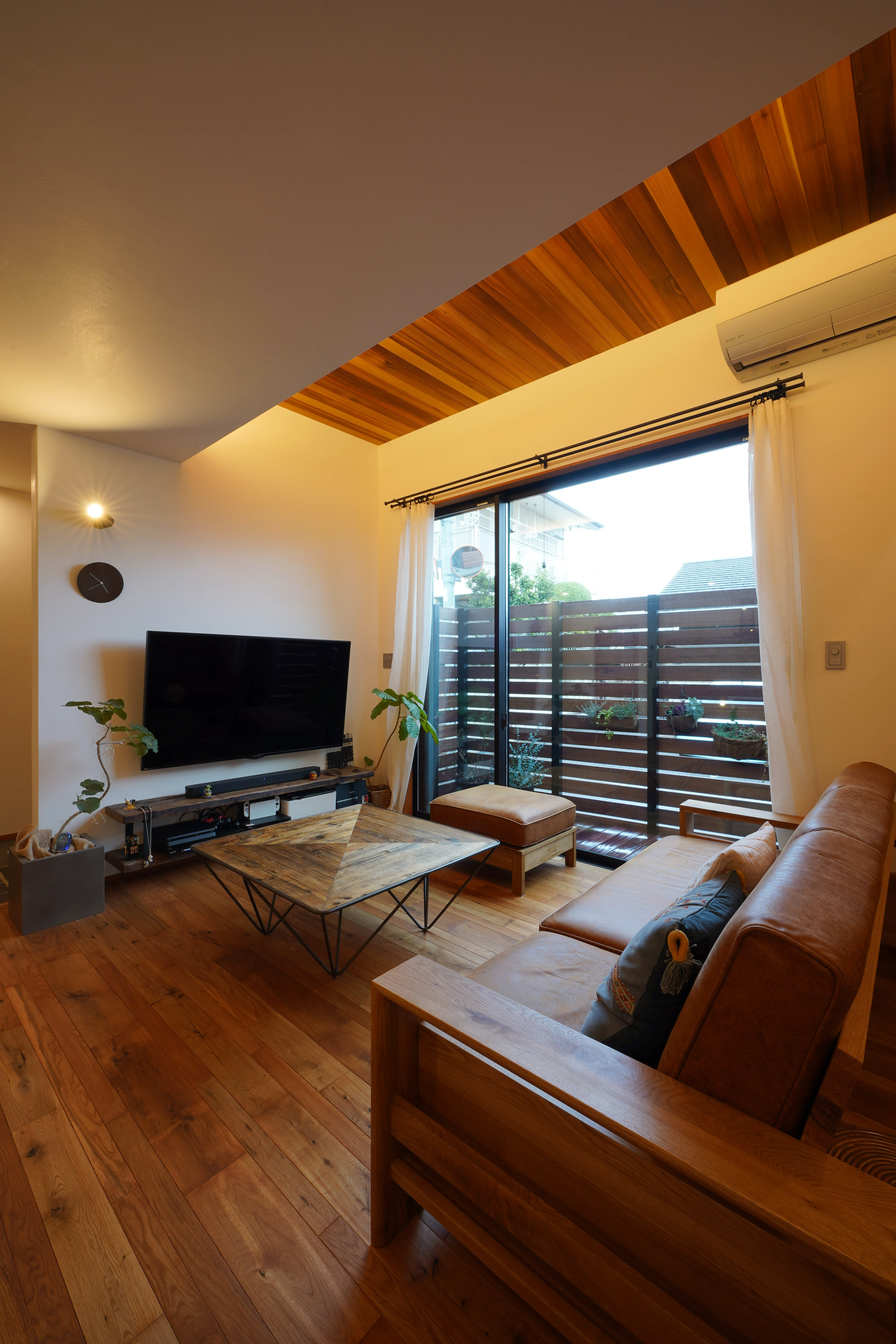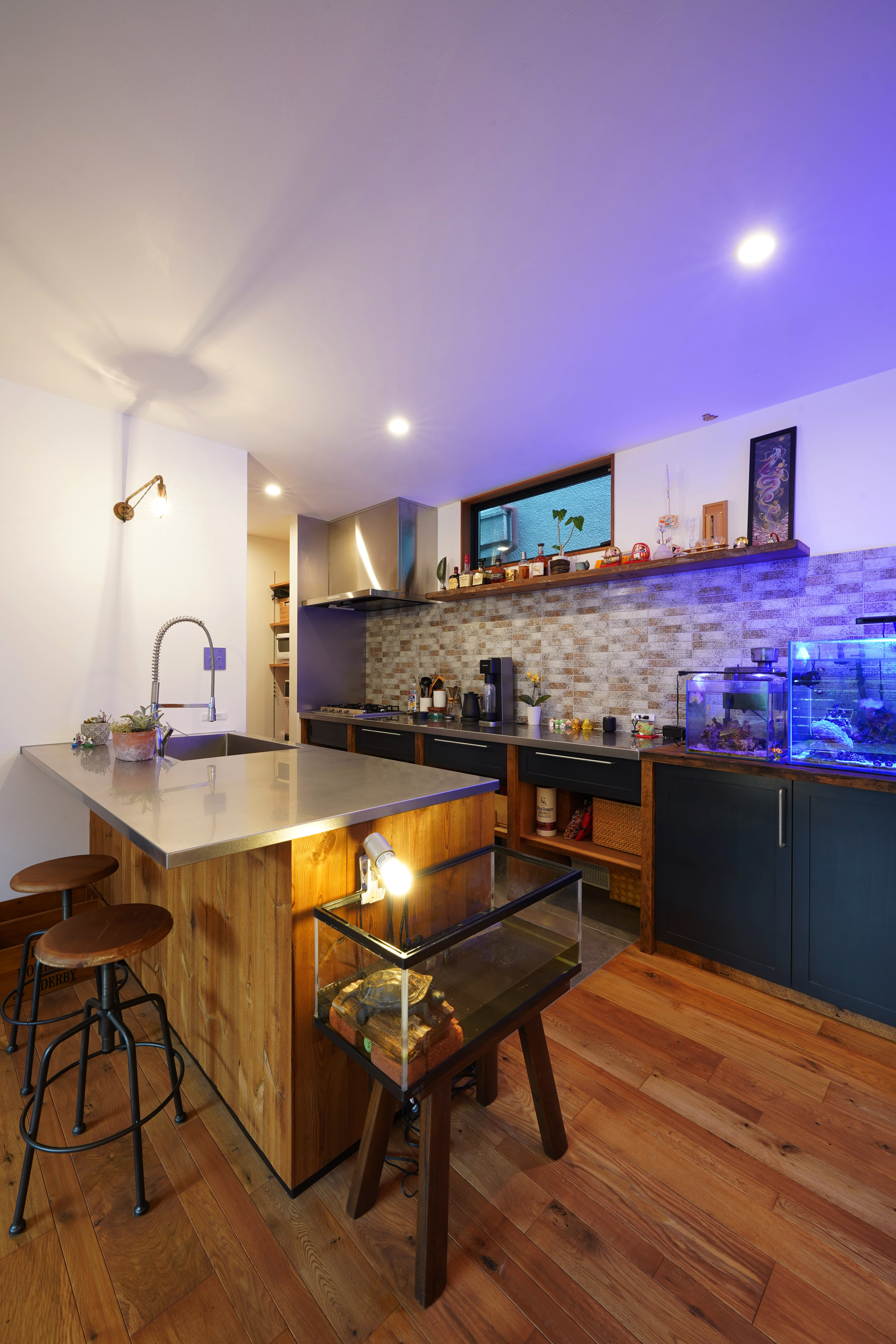 ピンコロ敷きの玄関土間と、リビング、キッチンダイニングがつながったワンルームスタイルのお家。暮らす家族との距離感が居心地よさを感じられる広さのお家です。幅も長さも違う乱尺のオークの無垢の床材がベーシックに個性を立たせつつ、古材やサーモパイン材を使ったオリジナルのキッチンはラフな木のもつ素材感を十分感じられる仕上りで、インテリアの主役にもなっています。2階のお部屋のひとつがスキップフロアになって、高天井のリビングで抜けも感じられると思います。